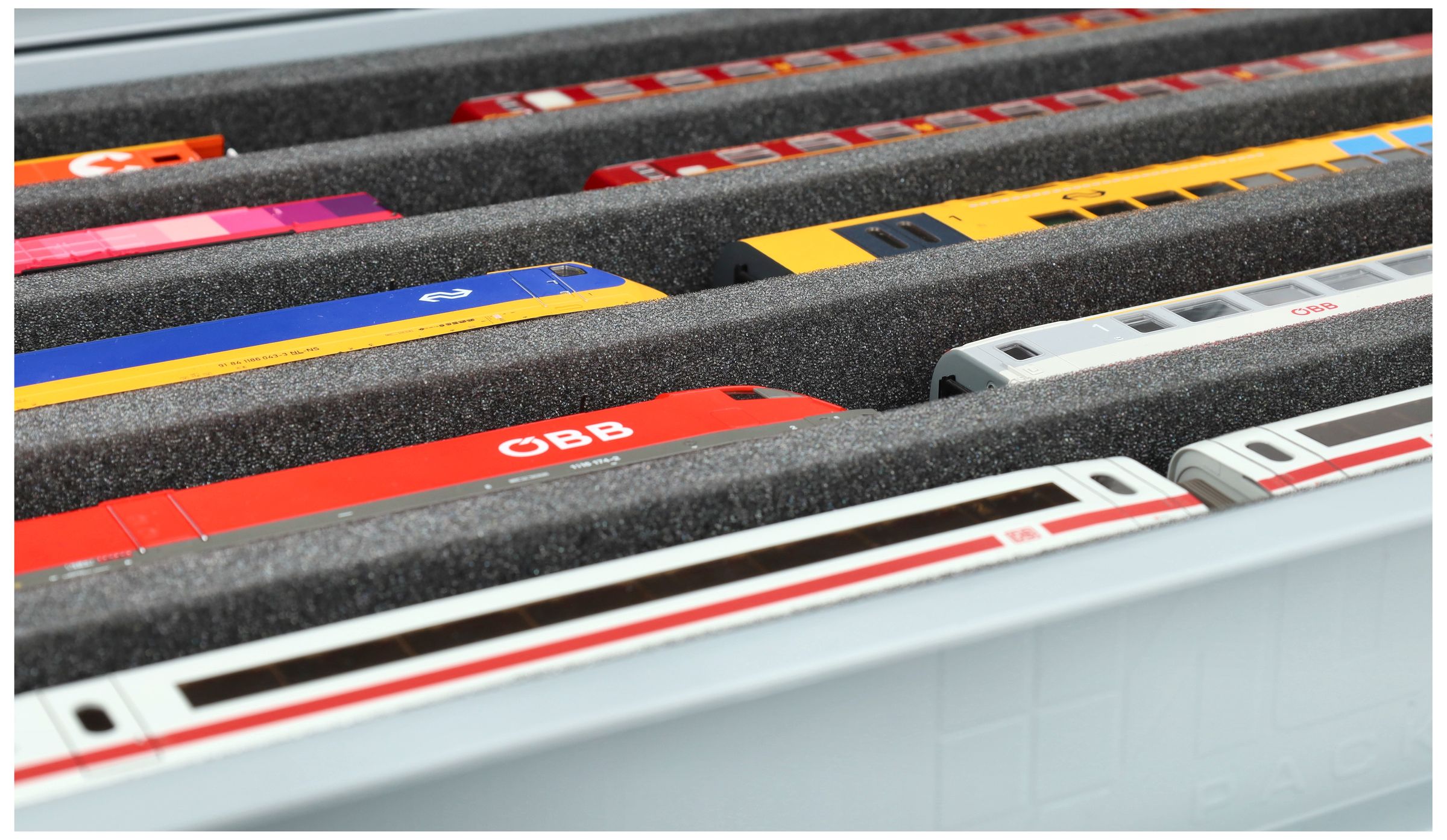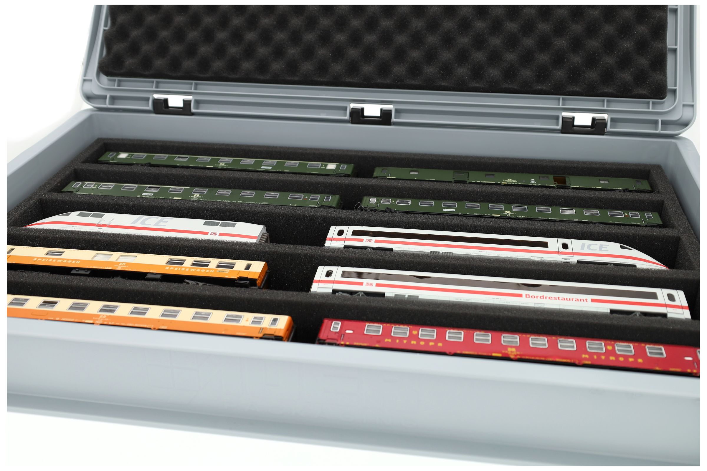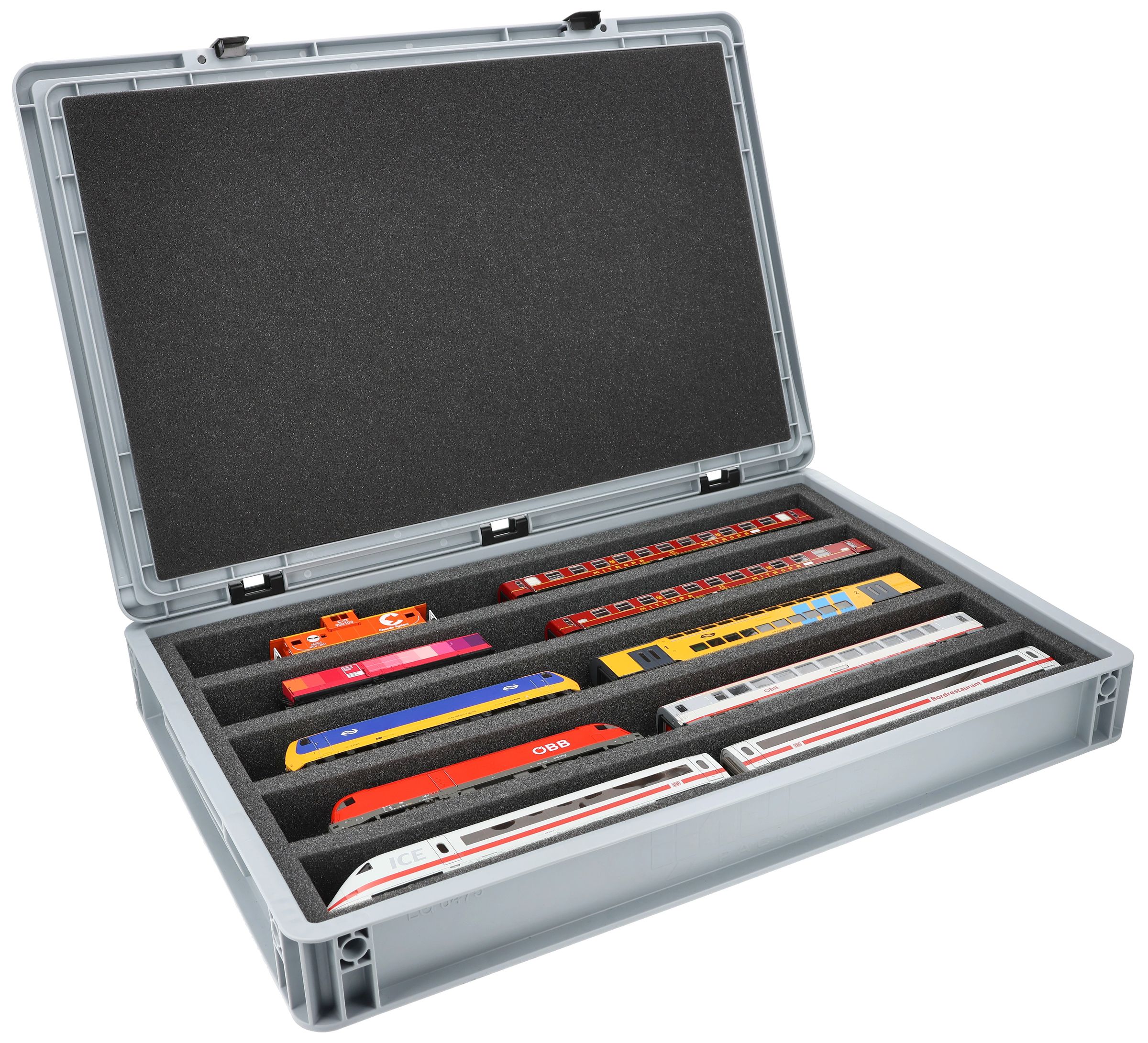 The 5 equal-sized compartments (each approx. 550 x 55 x 40 mm) are specially designed for H0 scale models. Thanks to the long compartments, locomotives and wagons can be placed side by side. The exact fit ensures that the models are securely fixed and do not slip during transport.