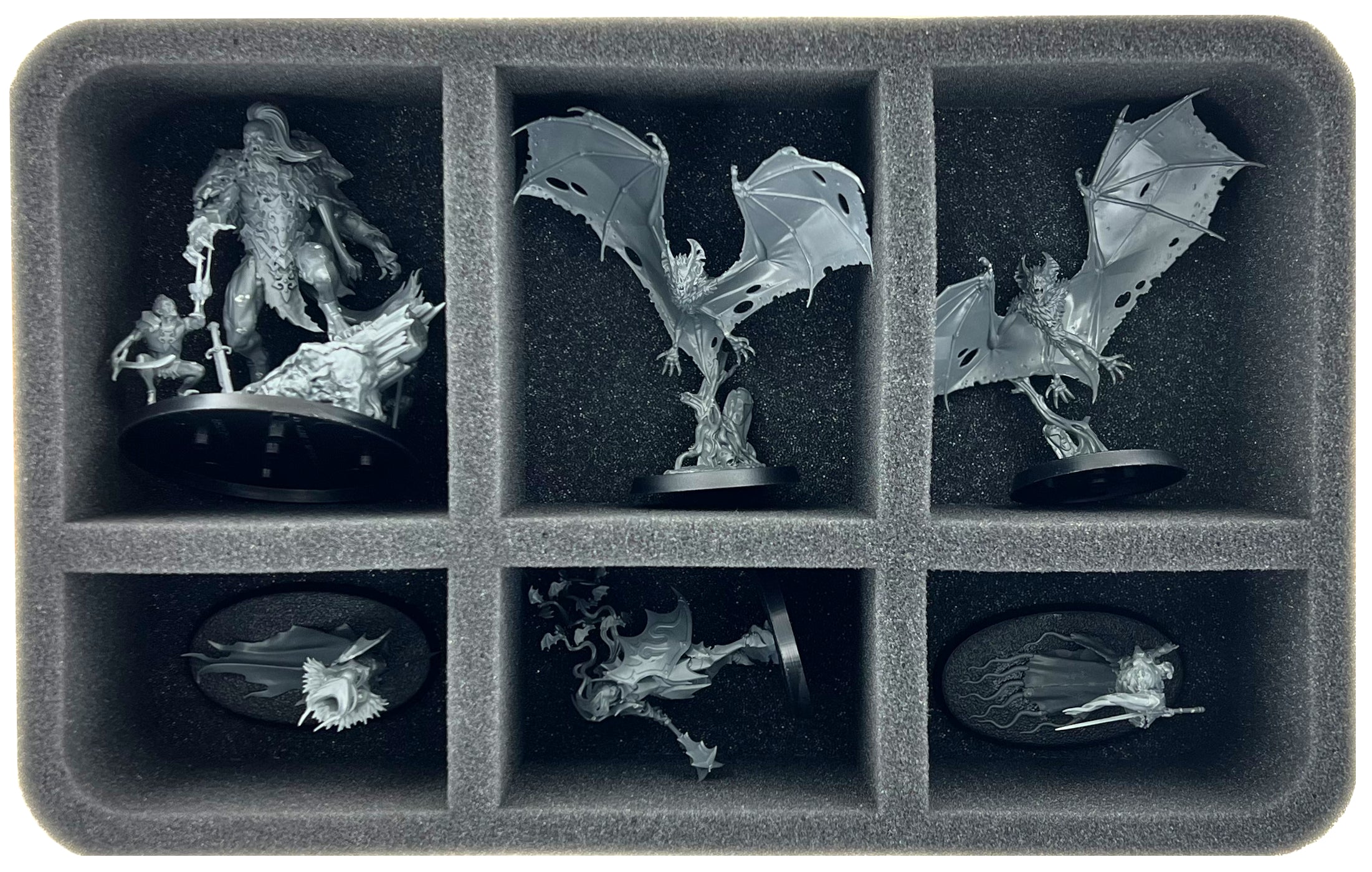 • 1 Half-Size foam tray with six compartments for medium-sized infantry like Glaurio ven Alten III, Torgillius the Chamberlain, Gorslav the Gravekeeper + models of similar size (HSMFAJ070BO)