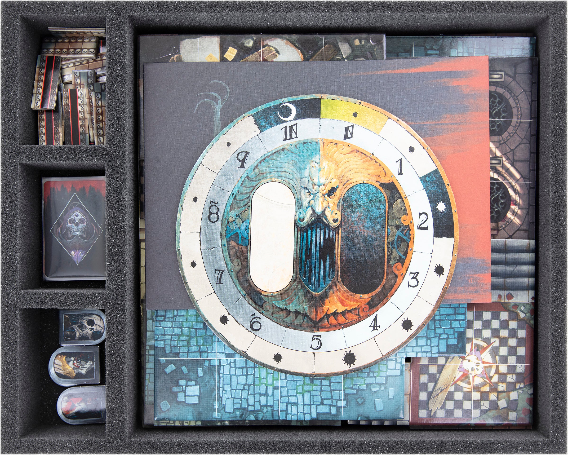 1 carrying bag, 2 Storage Boxes, 2 Full-Size, and 8 Half-Size foam trays are at your disposal to safely store and transport Cursed City with all its nightmares and monsters.