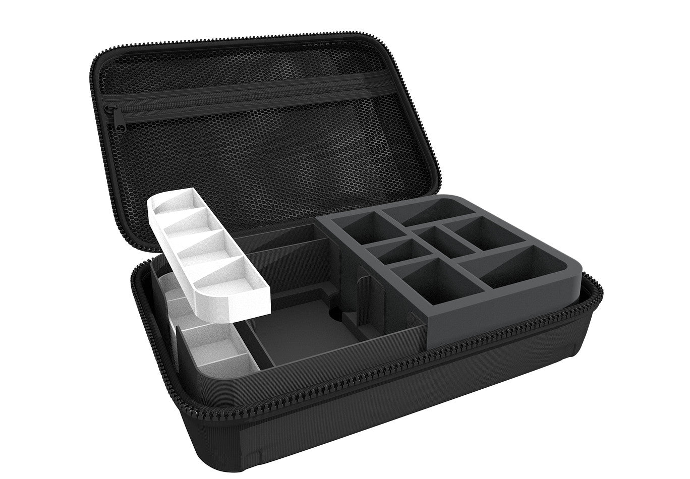 - Up to 5 models attached to pegs and bases + accessories like dice and tokens fit into the foam insert.
