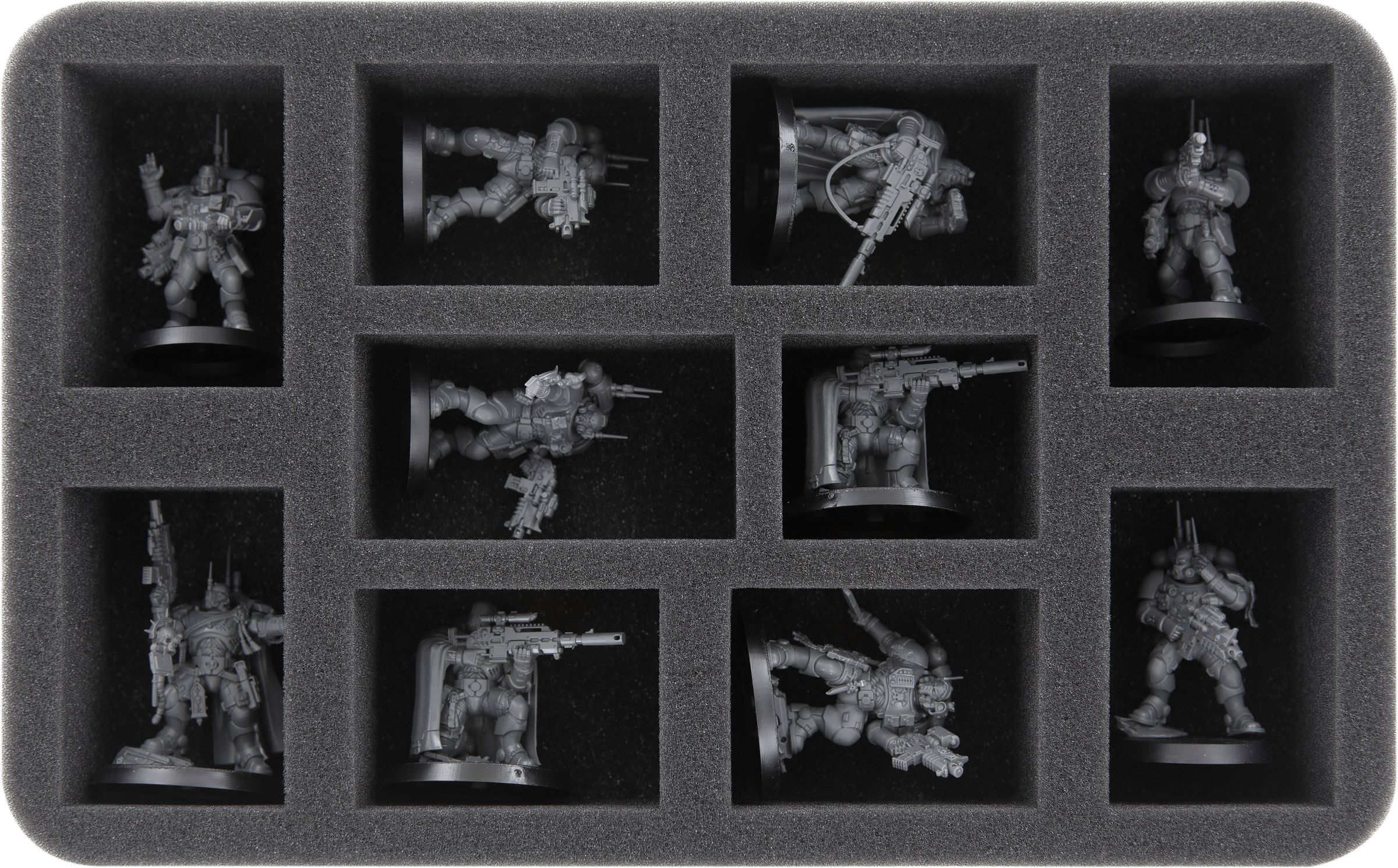 - 1 Half-Size foam tray with 10 compartments for standard infantry miniatures on up to 40 mm base (HSLM050BO)