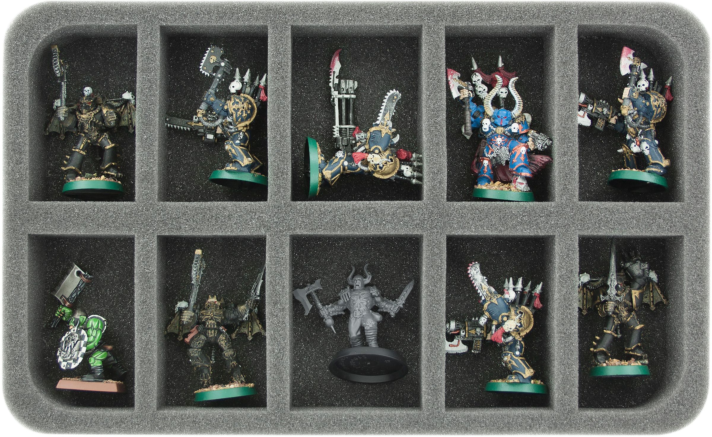 The foam trays have 10 compartments each for the safe storage of your miniatures. The fine-pored foam reliably protects your figures – fragile parts remain intact, the color of painted models remains unharmed.