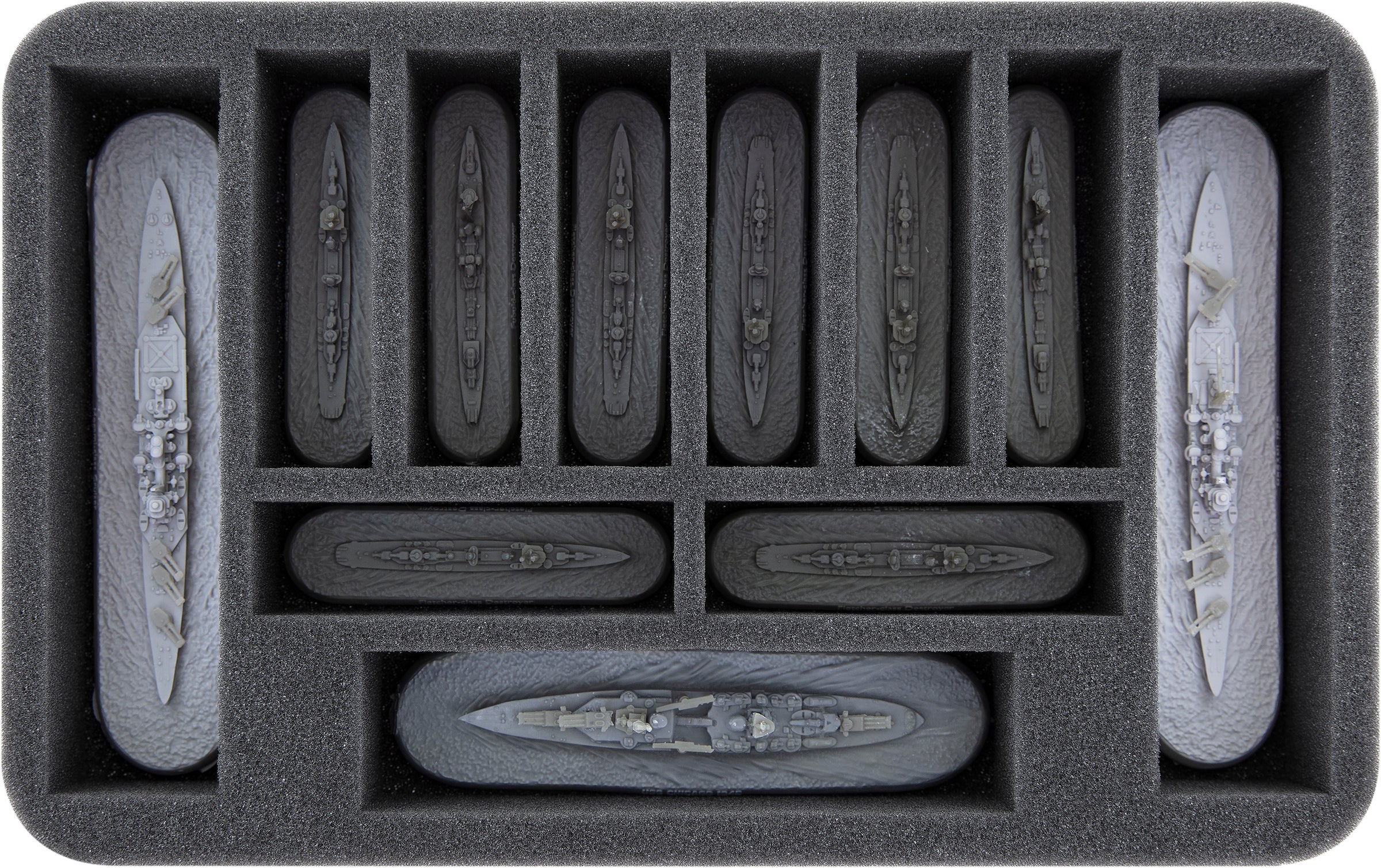A total of 22 compartments are available for your miniatures and game material. 16 small compartments offer enough space for the three Fubuki-Class Destroyers and the six Fletcher-Class Destroyers. Use the seven remaining compartments to organize dice, tokens, and smoke markers. The six large warships find their safe spot in the six larger compartments.