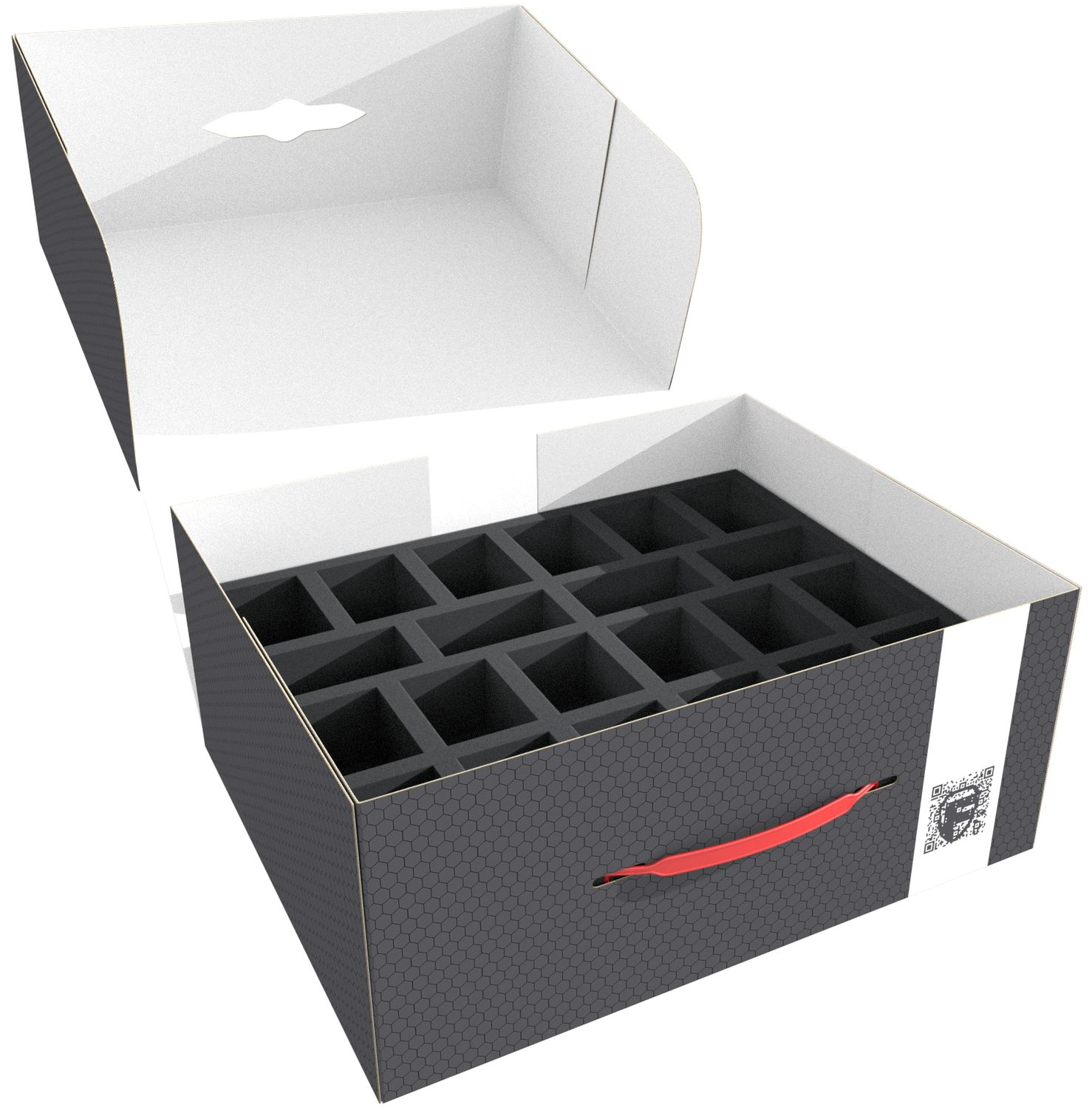 The foam trays have 66 compartments, total which will hold miniatures on 40 mm bases. The fine-pored foam reliably protects your figures – fragile parts remain intact, the color of painted models remains unharmed.