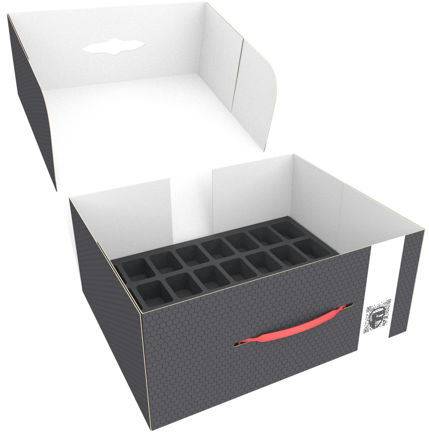 Of course, the foam trays fit exactly into the Storage Box FSLB150. The box - made of coated, corrugated cardboard - is not only light but also particularly stable. With the plastic carrying handle it can also be transported easily.