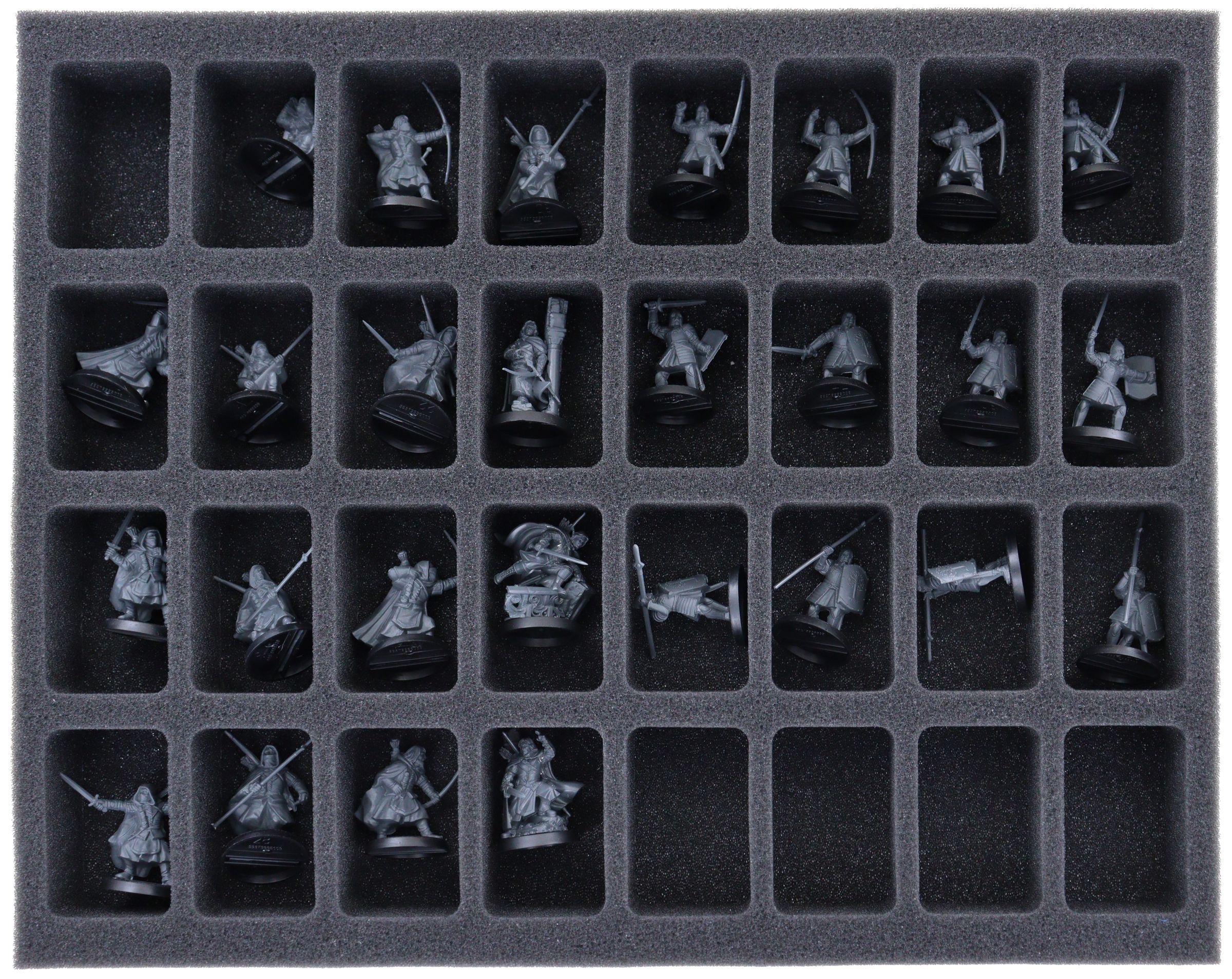 - 1 Full-Size foam tray with 32 compartments for Faramir, Damrod, Madril, Warriors of Minas Tirith, and Rangers of Gondor (FSMEDS040BO)