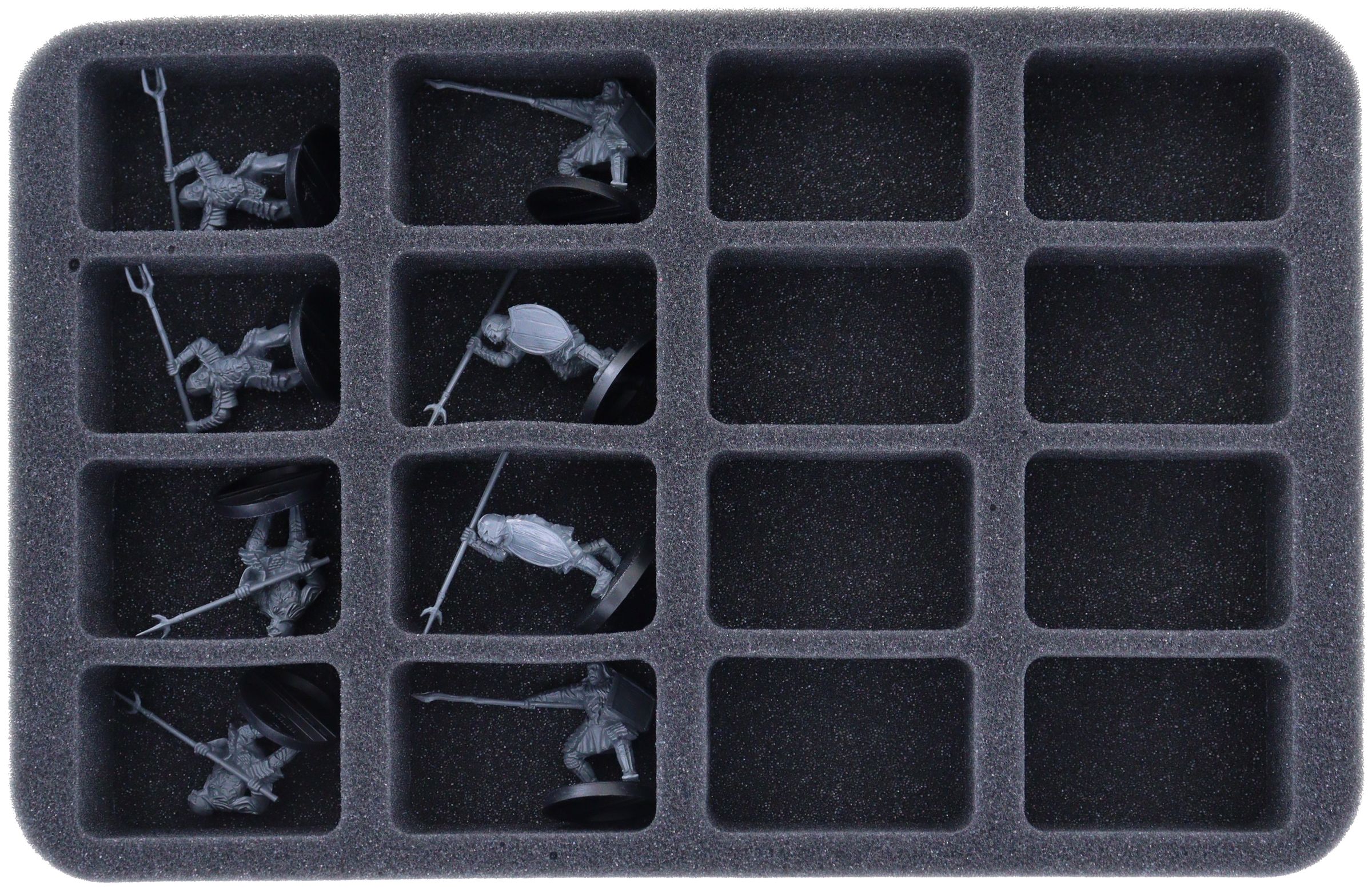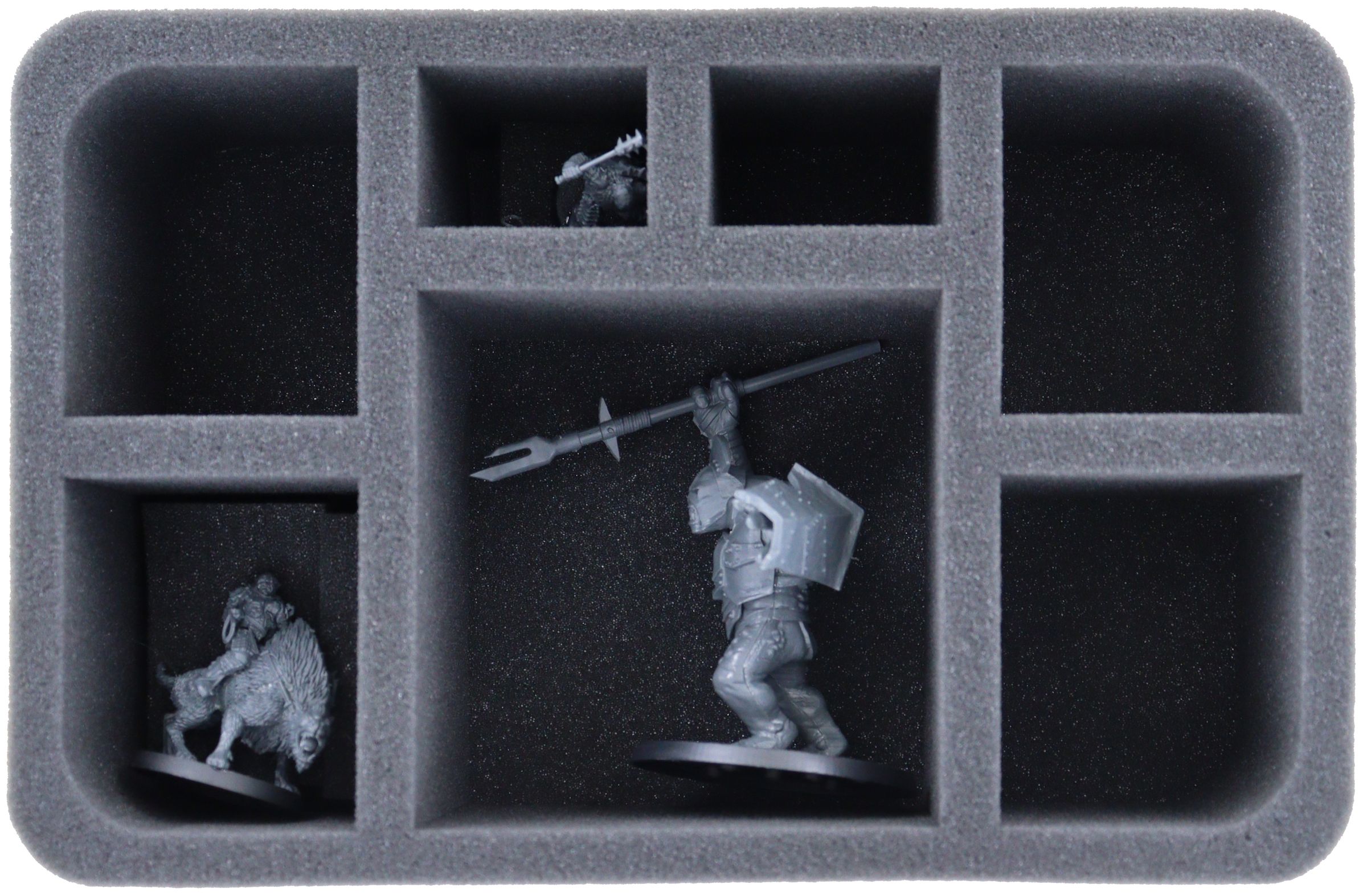 - 1 Half-Size foam tray with seven compartments for protruding units like Gothmog on Warg, Mordor Troll, and miniatures with similar dimensions (HSMEME090BO)