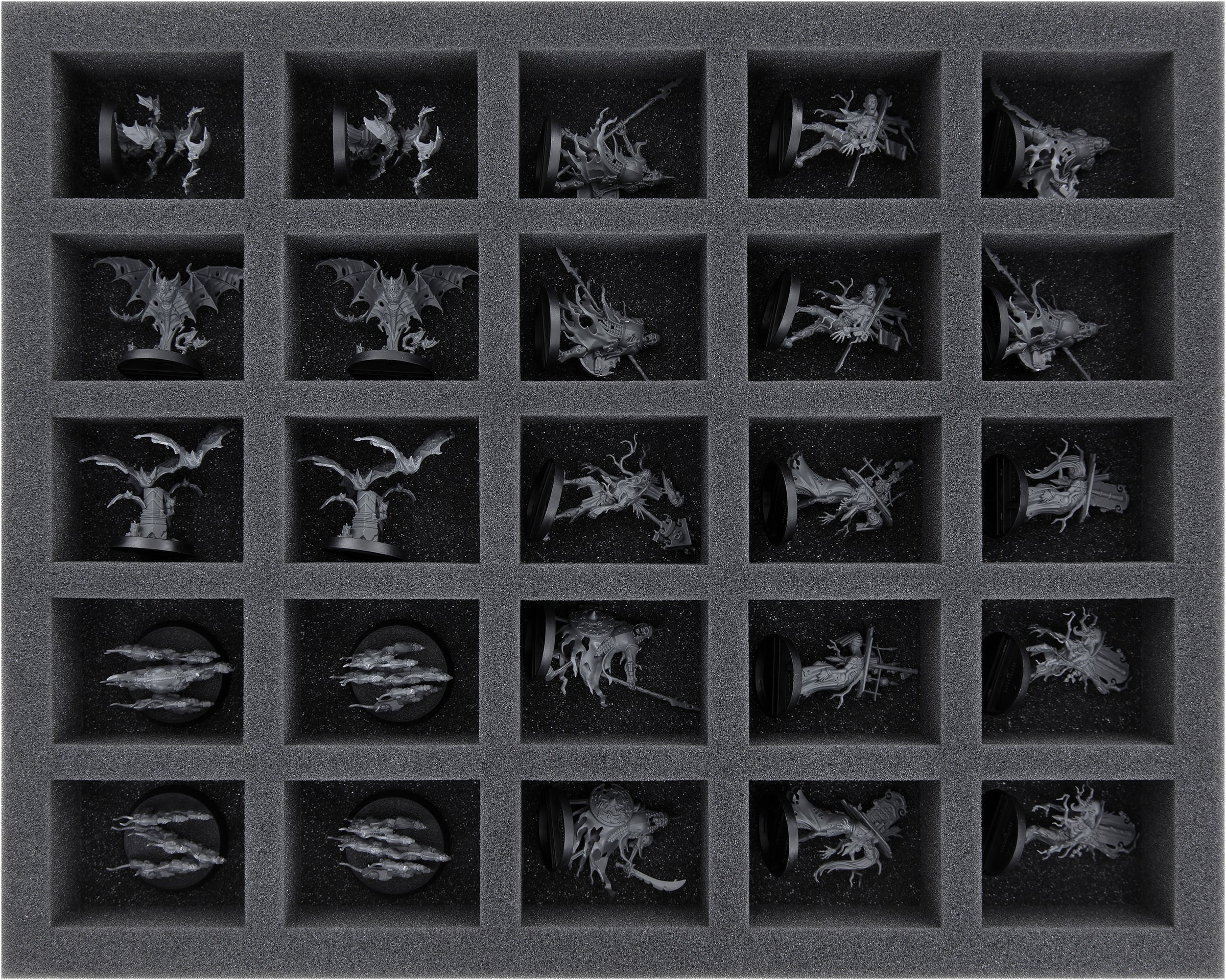 - 2 Full-Size foam trays each with 25 compartments for miniatures (FSLQ040BO)