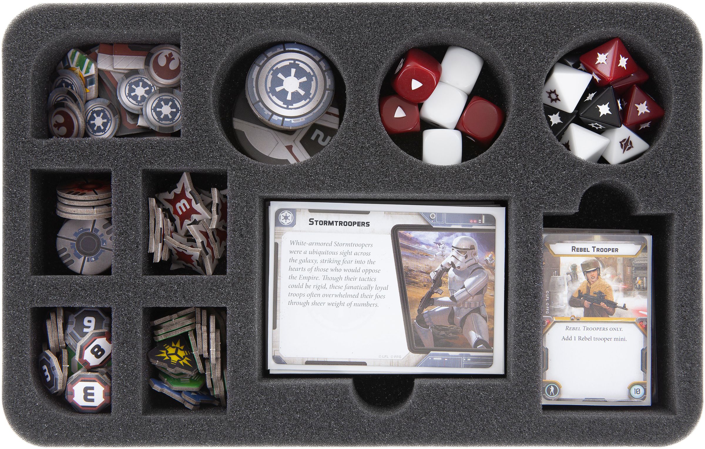 The HS065A003 Half-Size insert provides a safe haven for up to 15 Star Wars: Legion miniatures. In addition, it offers 8 compartments for standard infantry (e.g. stormtroopers), 4 compartments for medium-sized miniatures (e.g. Droidekas), 2 compartments for large figures and one in the middle for dice and token.