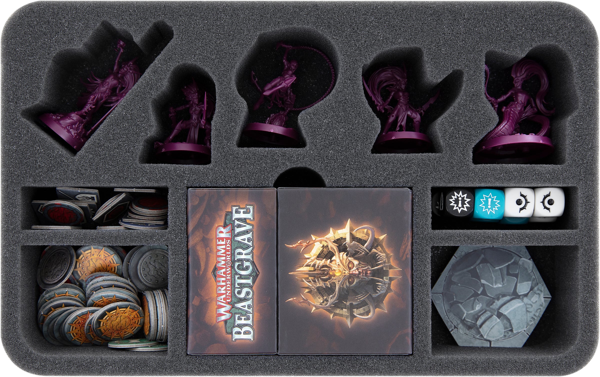 A further compartment is reserved under the miniatures for the cards. It is provided with a finger-wide recess so that you can get the decks out more easily. Up to 40 cards fit in here, of course also with sleeves. The compartment is also large enough to fit one Beastgrave Deckbox. Dice and tokens can be sorted into the remaining four compartments.