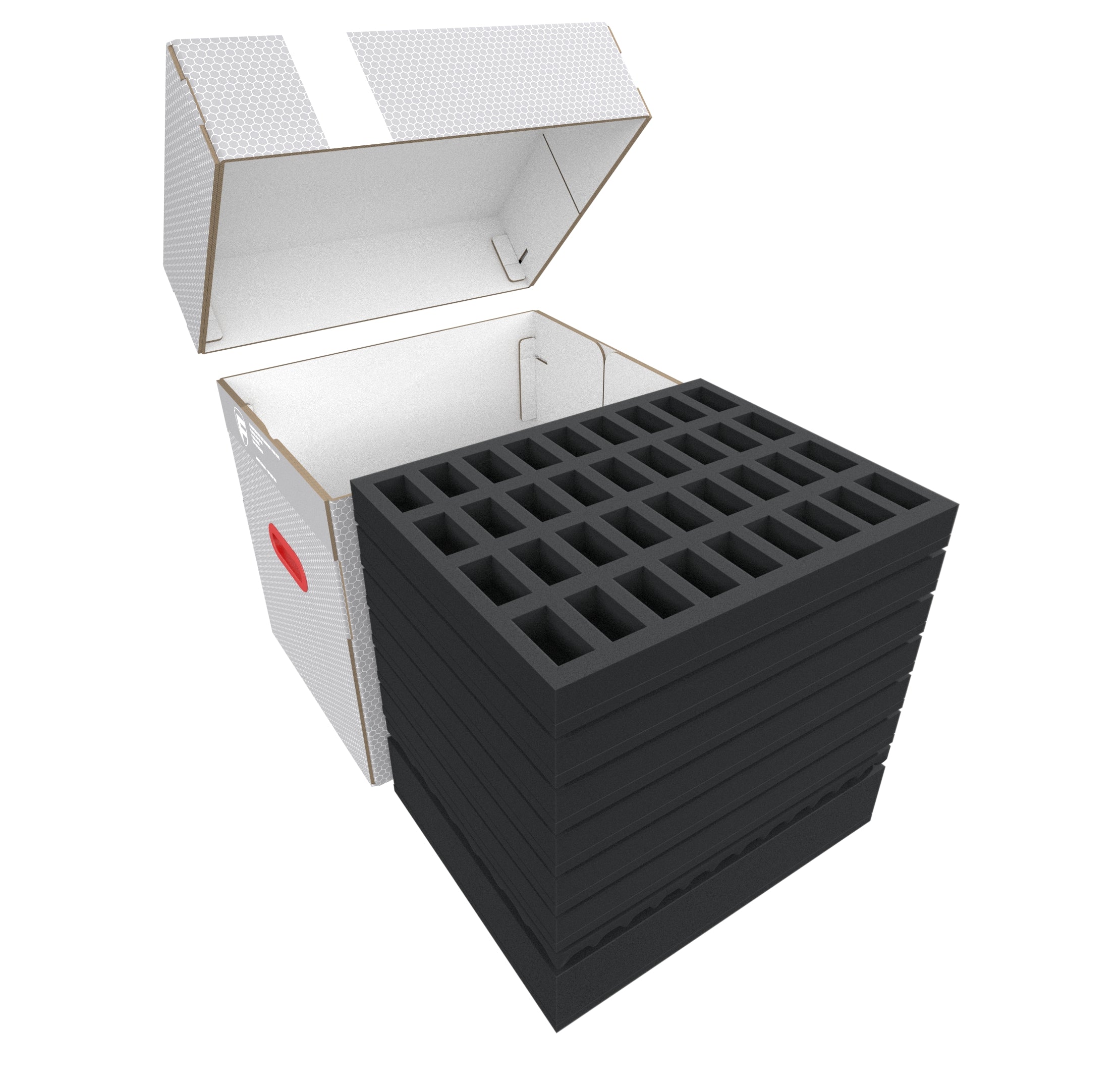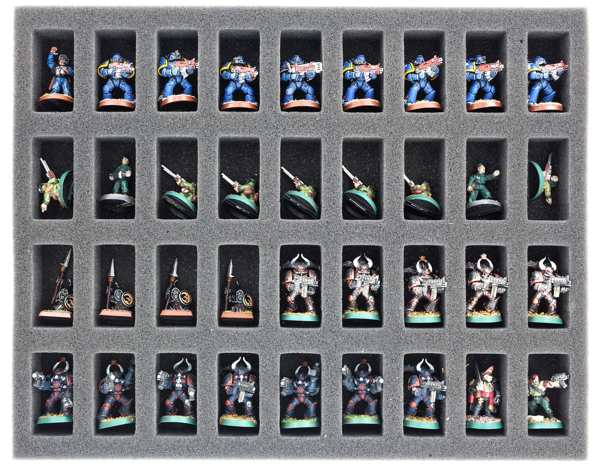 35 mm standard inserts each with 36 compartments: Particularly suitable for neat and safe storage of standard infantry and other board game and tabletop miniatures on 25 mm base.