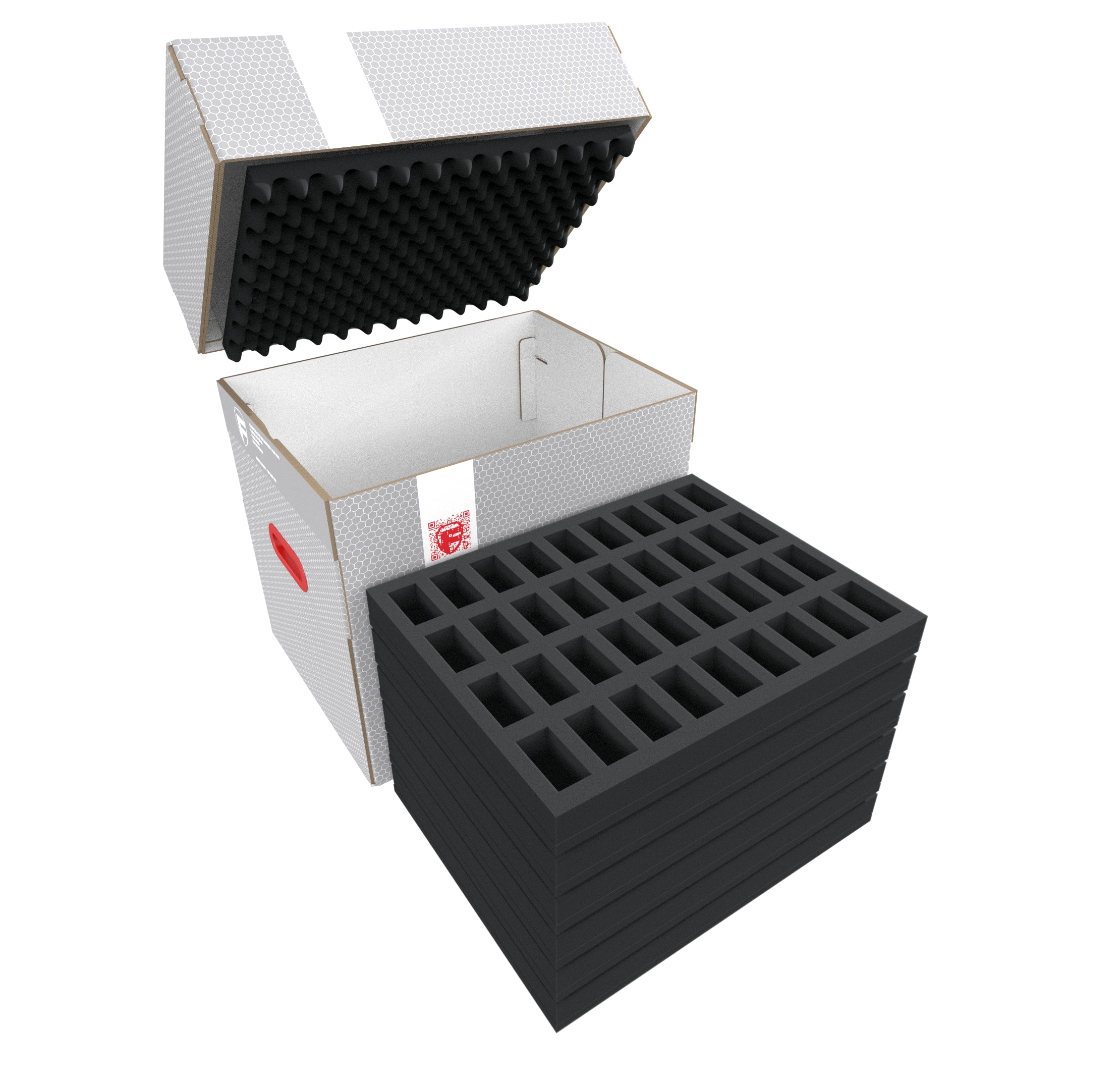 The light, robust Feldherr Storage Box FSLB310 for safe storage and transport of your miniatures. It comes filled with 8 foam inserts for standard miniatures on 25 mm bases, and is therefore ideal for storing your infantry and other classic hero and monster figures from different tabletop and board game systems.