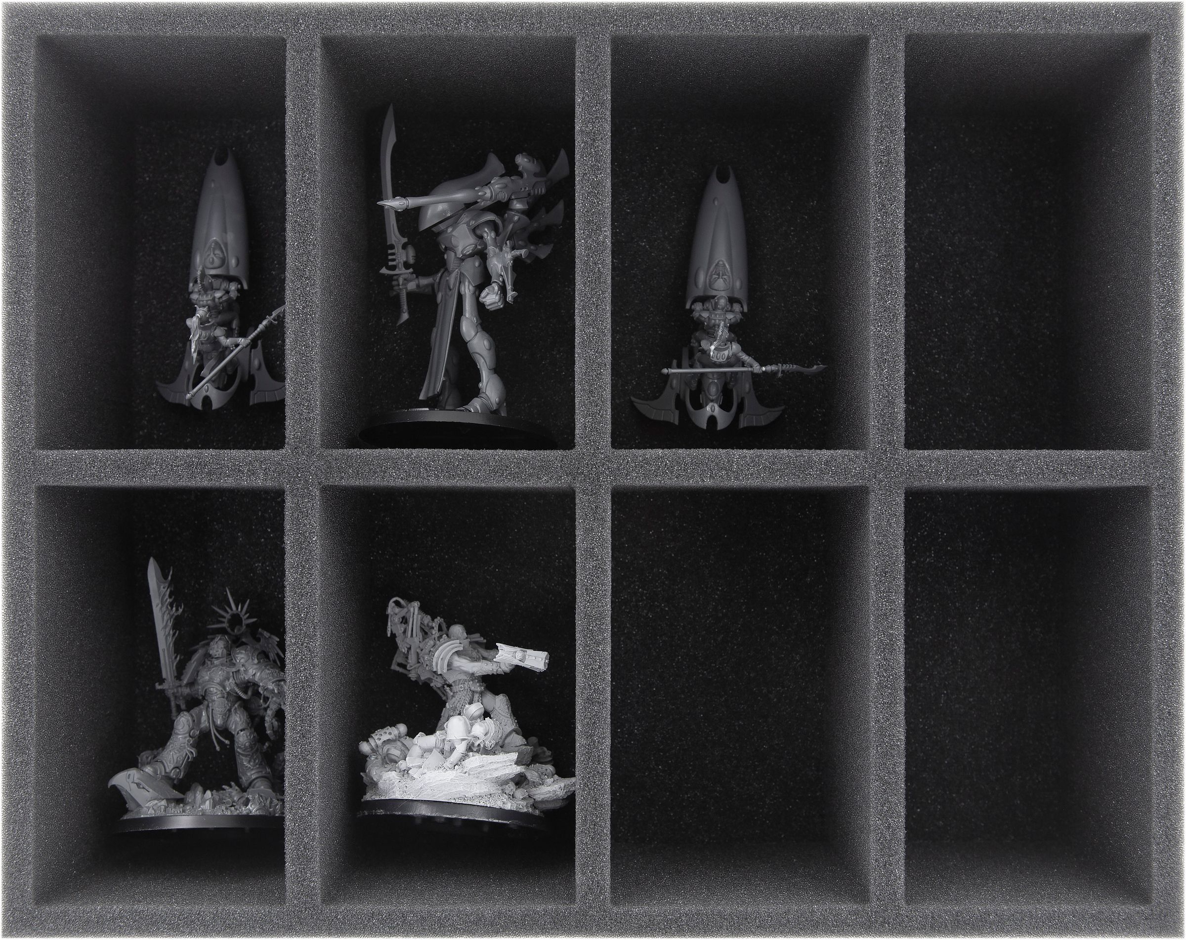 Large character models like e. g. the Wraithlord find a space in the foam tray with 8 compartments. The tray is also suitable to hold further vehicles.