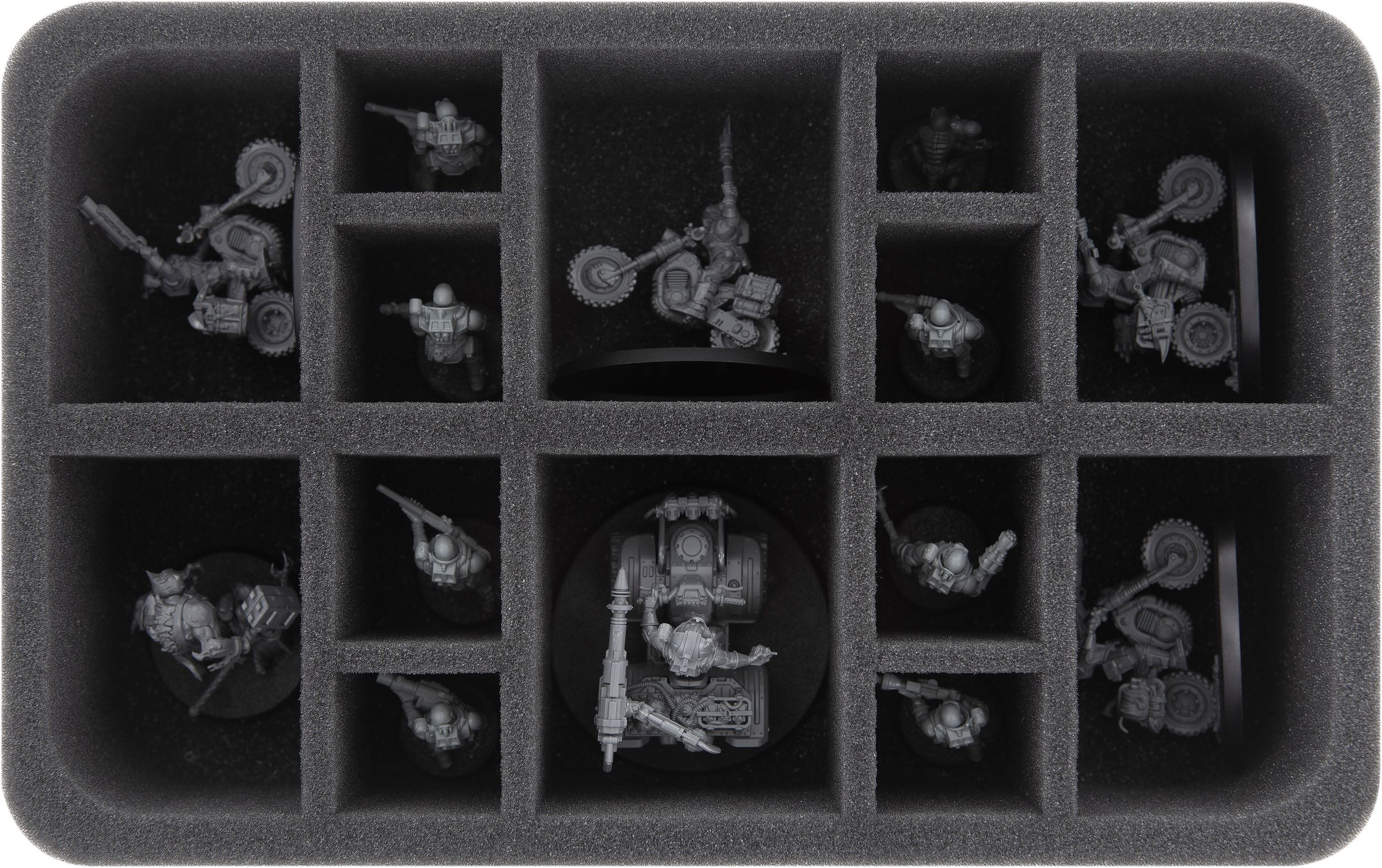 With the second Full-Size insert you can safely store up to 4 larger models. The four large compartments are ideal for Genestealer Cults vehicles such as the Ridgerunner and the Goliath Rockgrinder.