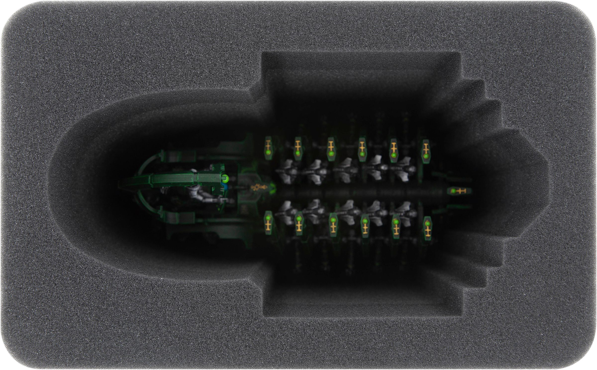 The tray for the Doom Scythe (or Night Scythe) features a custom compartment for the marvelous model. The miniature-precise cut ensures that the model lies absolutely securely in its compartment during transport and does not slip around. This not only protects the fine parts, such as the destructor and the death ray, from damage. The colors and transfer pictures of the finished painted aircraft are also protected from abrasion and scratches.