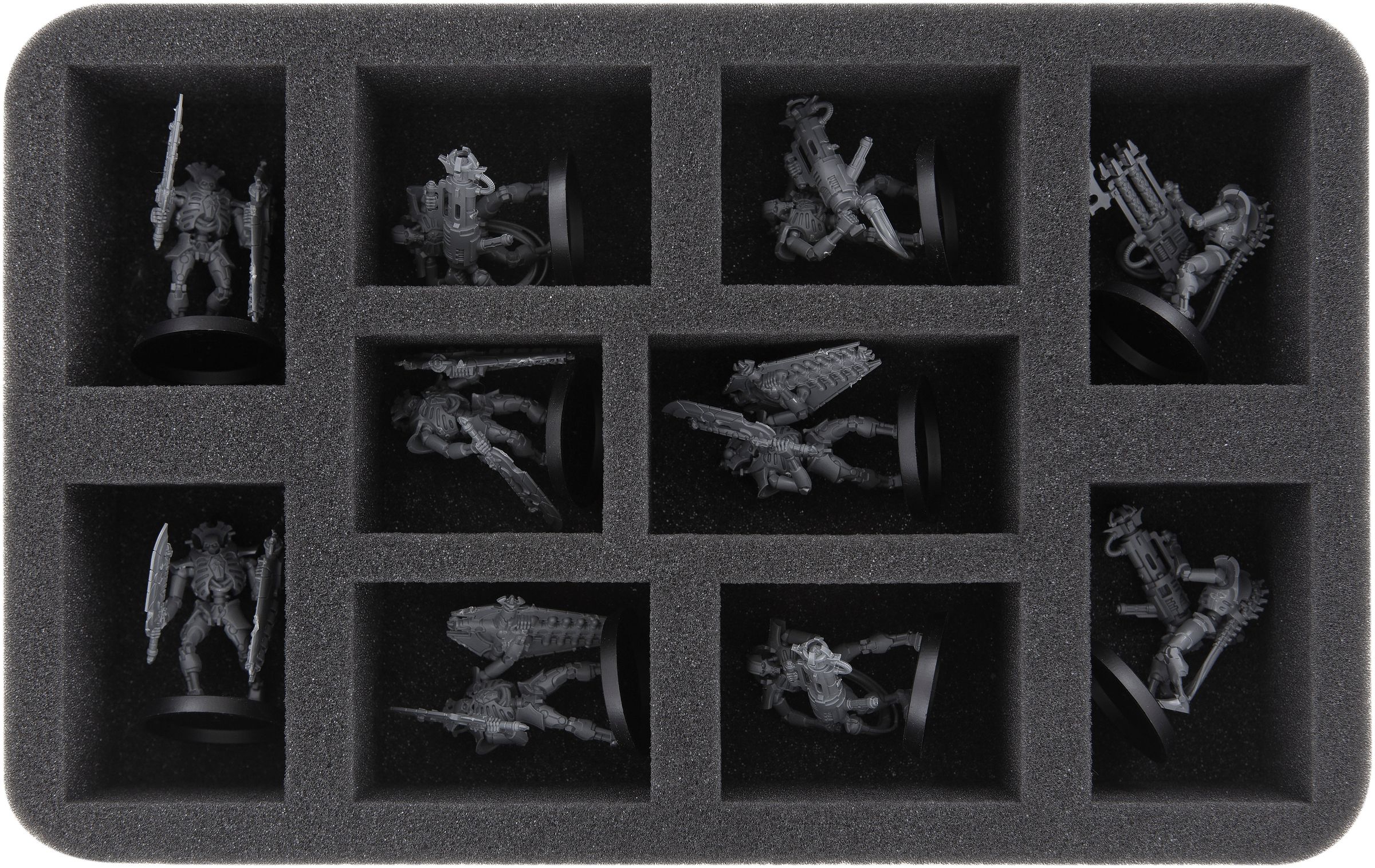 The 10-compartment-tray will hold differently-sized miniatures, like e. g. the Necron Overlord and standard warrior models.