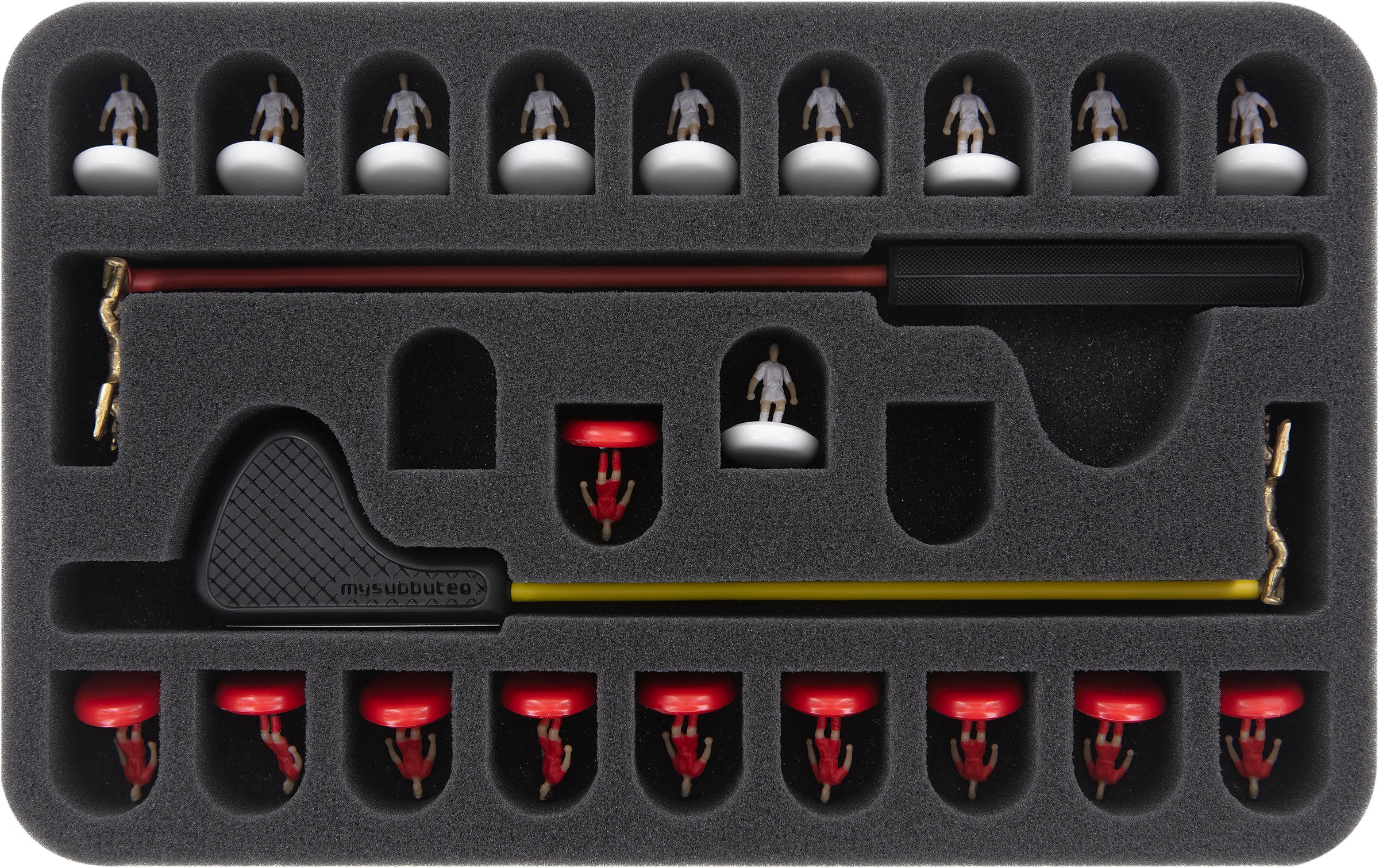 Our Half-Size foam insert offers space for a total of two Subbuteo teams. Each team gets tailor-made compartments for 11 field player figures and one goalkeeper.