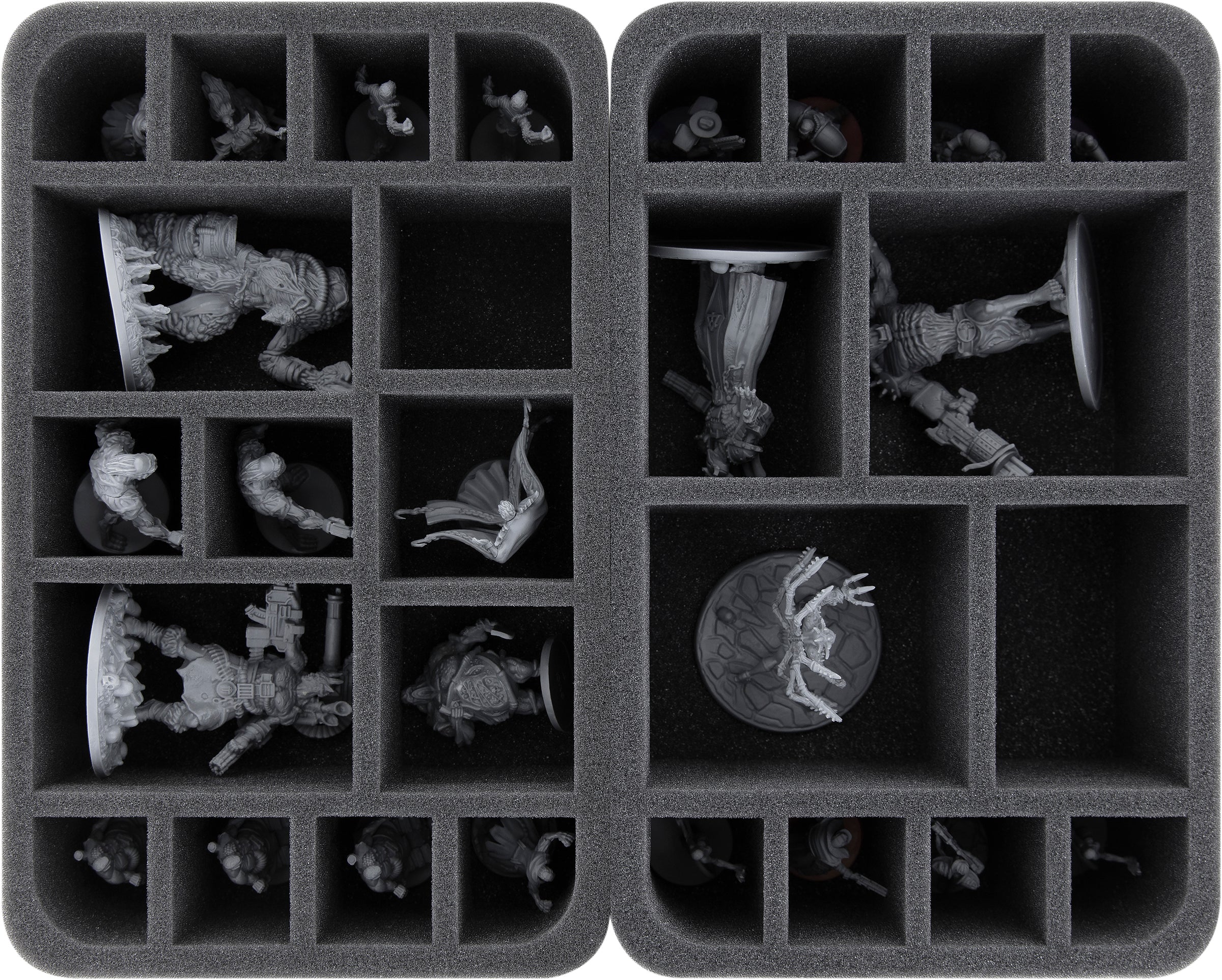 A compartment for every miniature, whether it's a cute Chibi bonus figure, giant Apostle Algeroth, or one of the Dark Legion's many monstrosities. Each of your miniatures will find a compartment to fit in the four Feldherr Half-Size foam trays.