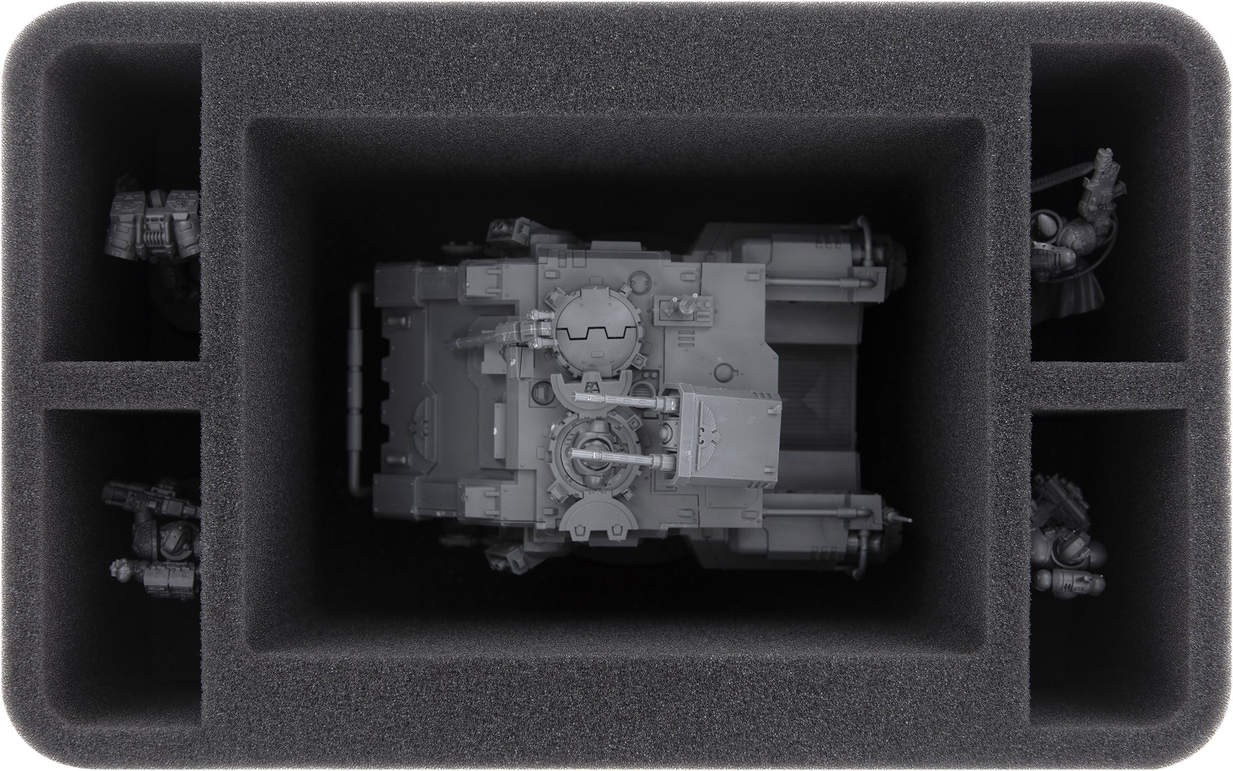 Your Impulsor is best stored in the smaller Half-Size foam tray. In addition to the large compartment for the Impulsor, you are left with four rectangular compartments that can hold additional Adeptus Astartes units on 32mm bases.