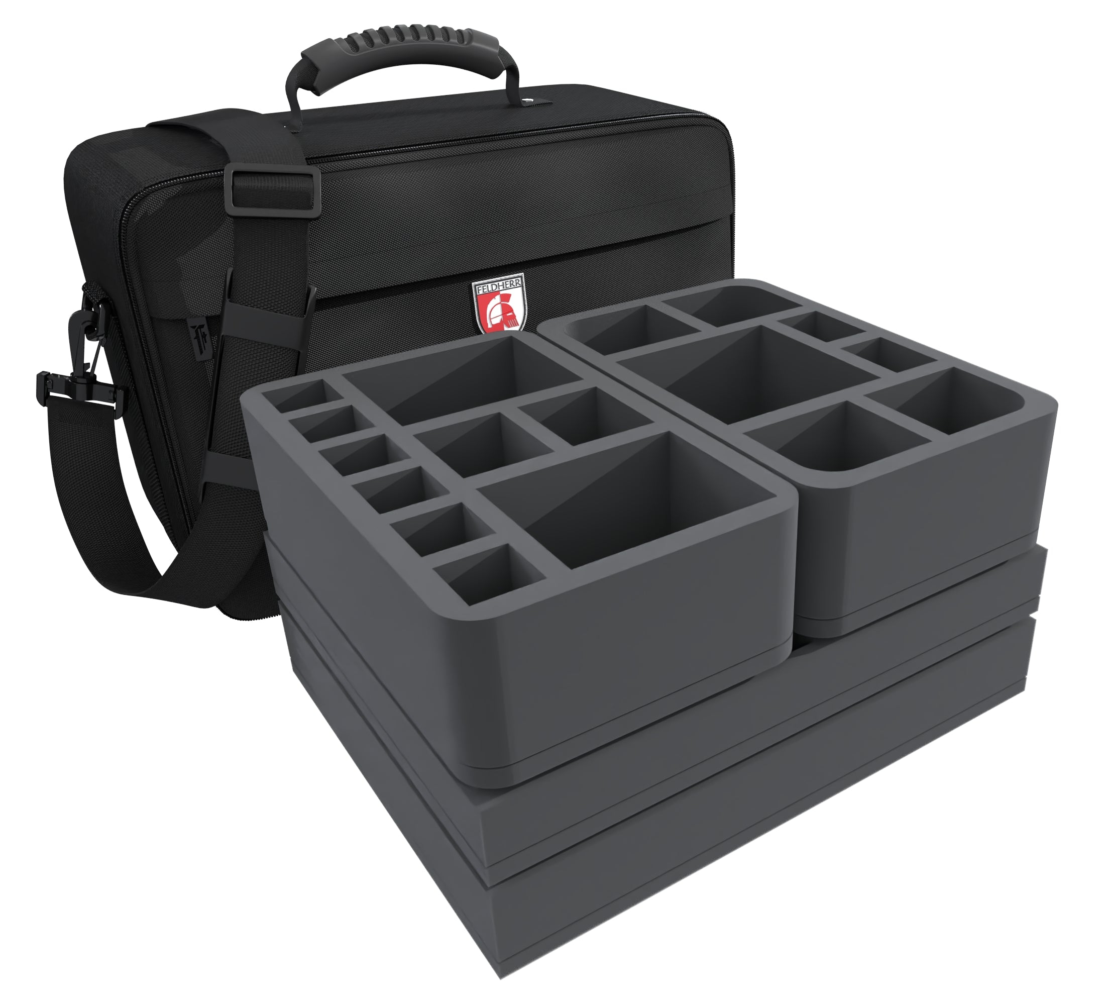 Of course, the inserts fit exactly into the sturdy MAXI bag. This is made of particularly hard-wearing material. Padded side panels and a reinforced base also ensure that your models are well protected from external influences, even when being transported by car or train. In addition to the large main compartment, the bag has a small zippered compartment at the front. There is a rubberized, handy carrying handle on the top. If you prefer to have your hands free, you can also use the bag as a shoulder bag thanks to the hard-wearing, detachable shoulder strap.