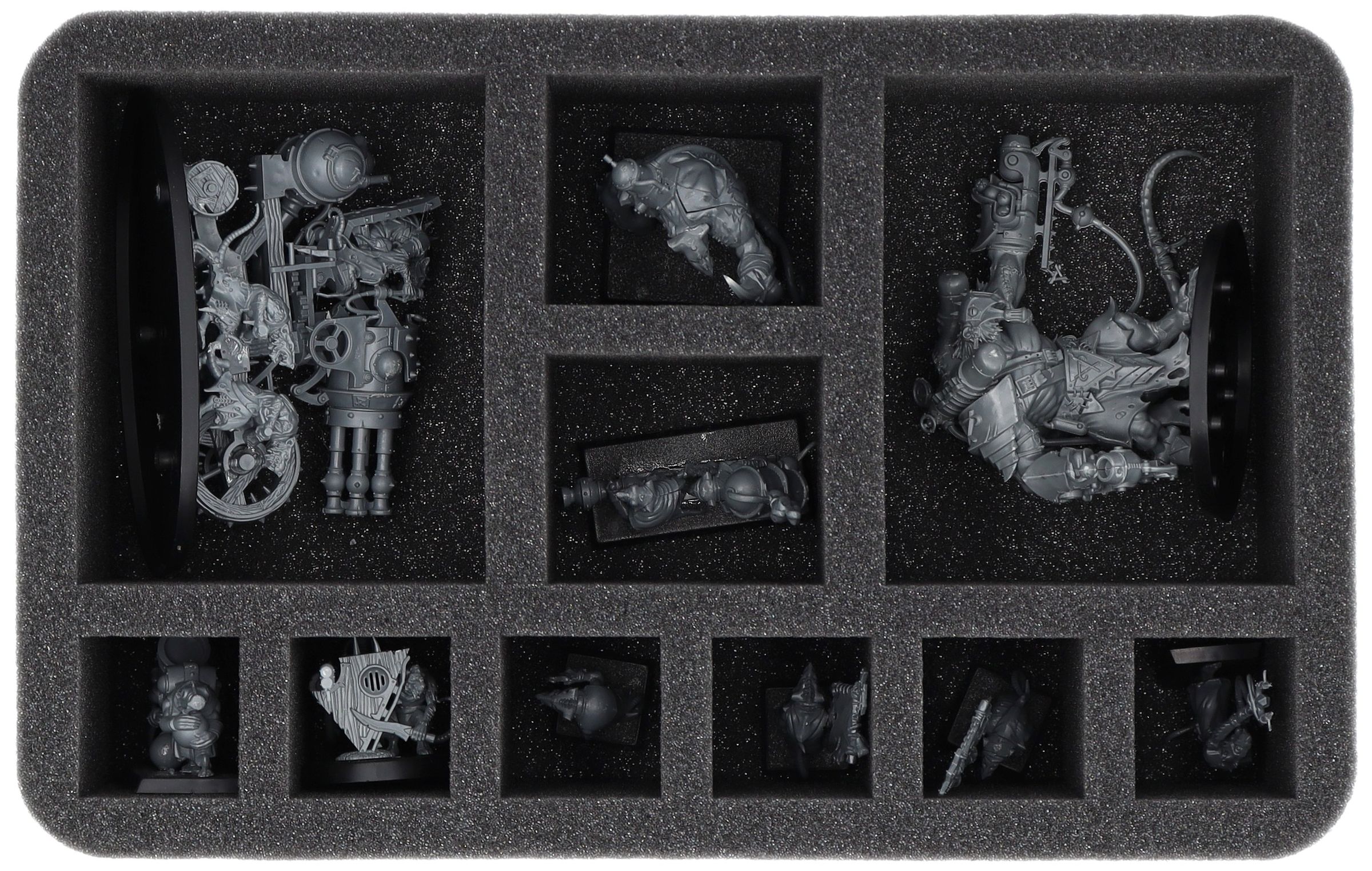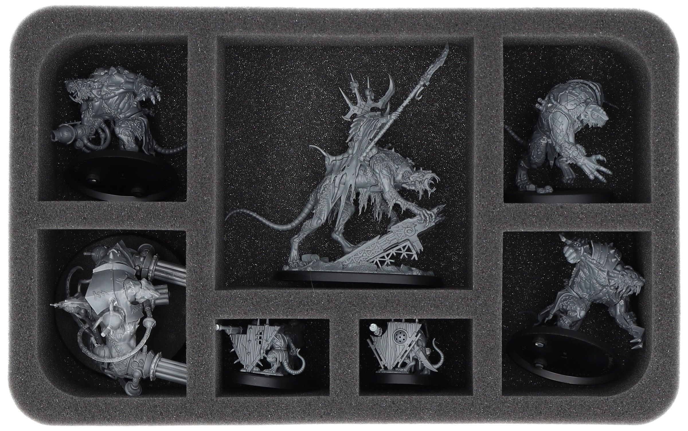 - 1 Half-Size foam tray with 10 compartments for miniatures like the Rat Ogors, Ratling Warpblaster and similar sized models (HS080A031)