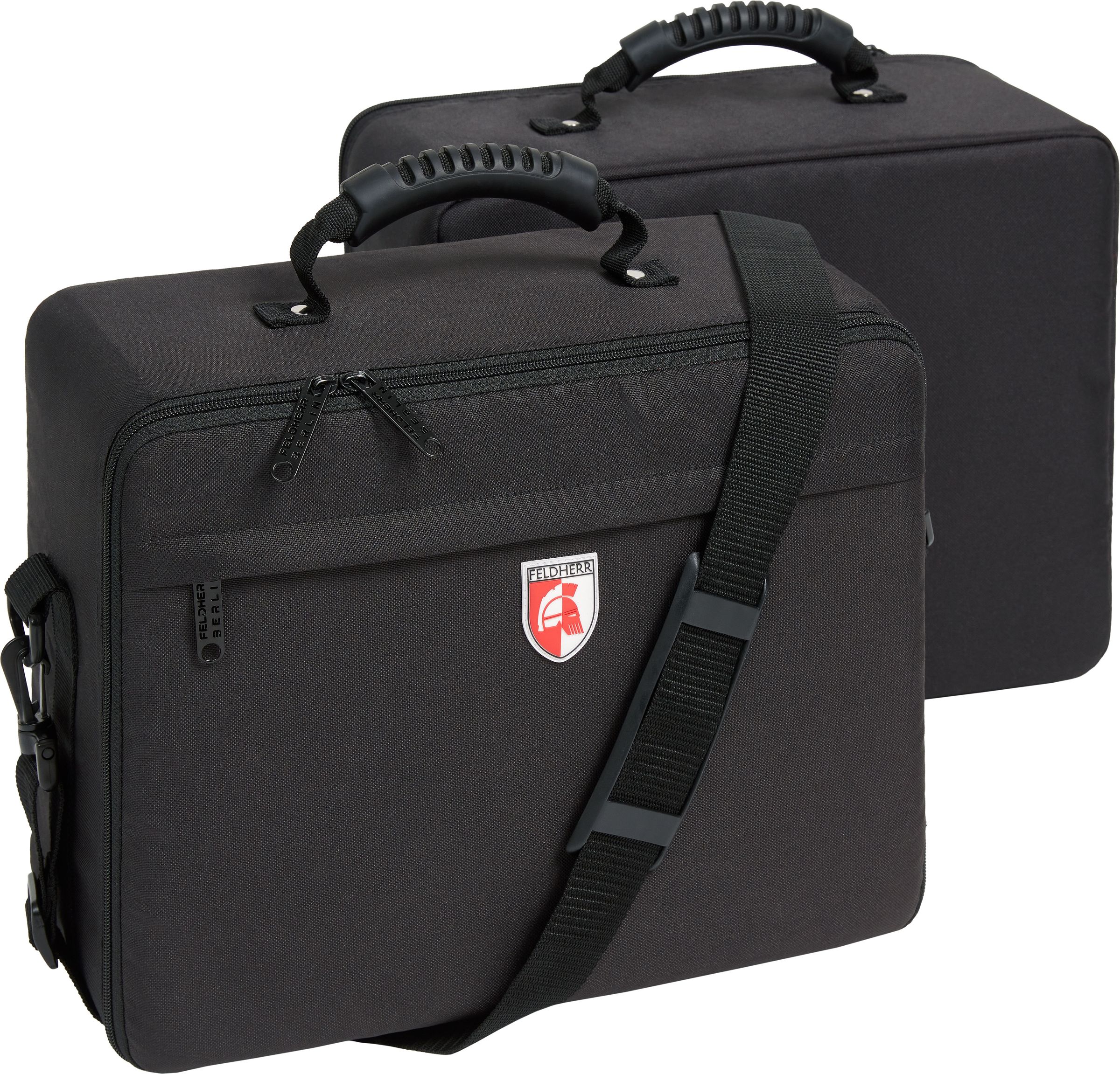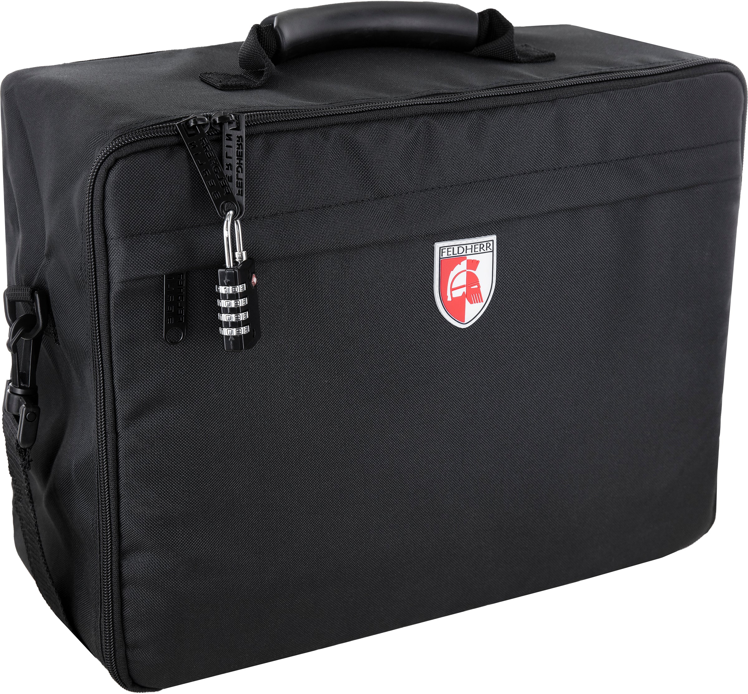 The black Feldherr MAXI bag is made of particularly hard-wearing fabric. Padded side panels and a reinforced base additionally ensure that the contents are optimally protected from external influences even when transported by car or train. It can also be locked and connected with an optional padlock. Next to the large main compartment, the bag has a smaller pocket with a zipper at the front. Game sheets, books and writing material can be stored here, for example.