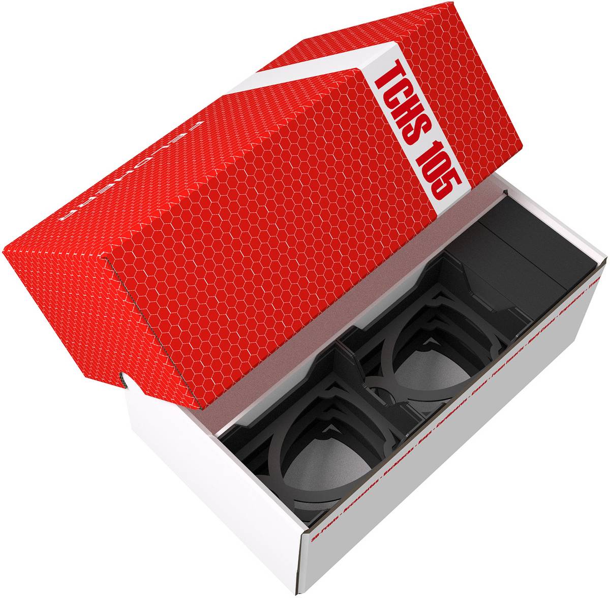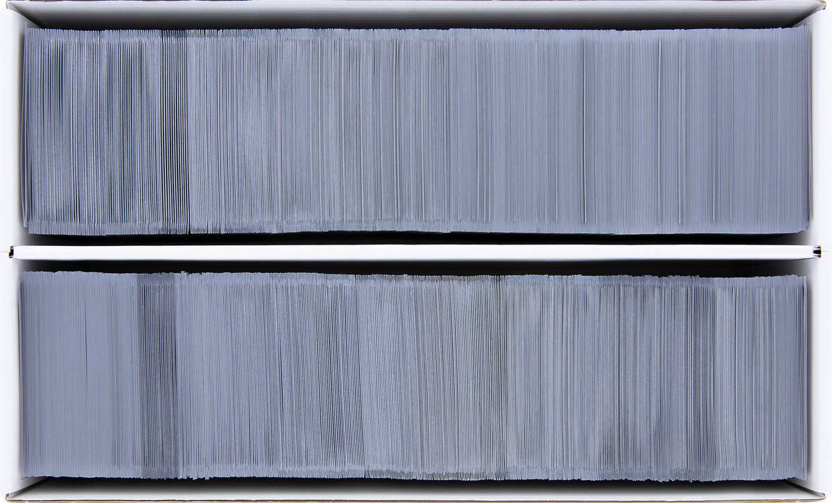 A partition in the middle of the box divides it into two equal-sized compartments. This allows the cards to be lined up neatly without mixing during transport.