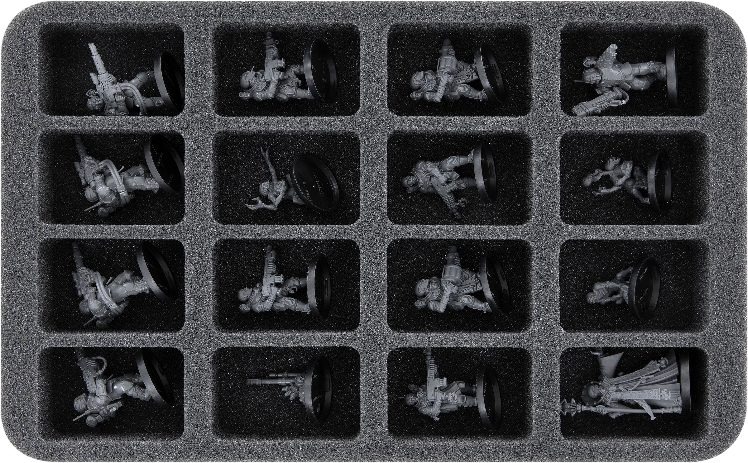 32 miniature in your collection gets its own custom-fit compartment here. For additional units, you are left with 15 free compartments. This ensures that your models remain safely in place during transport. The soft foam protects the sensitive parts of your figures and the colors of painted miniatures are just as safe from abrasion and scratches.