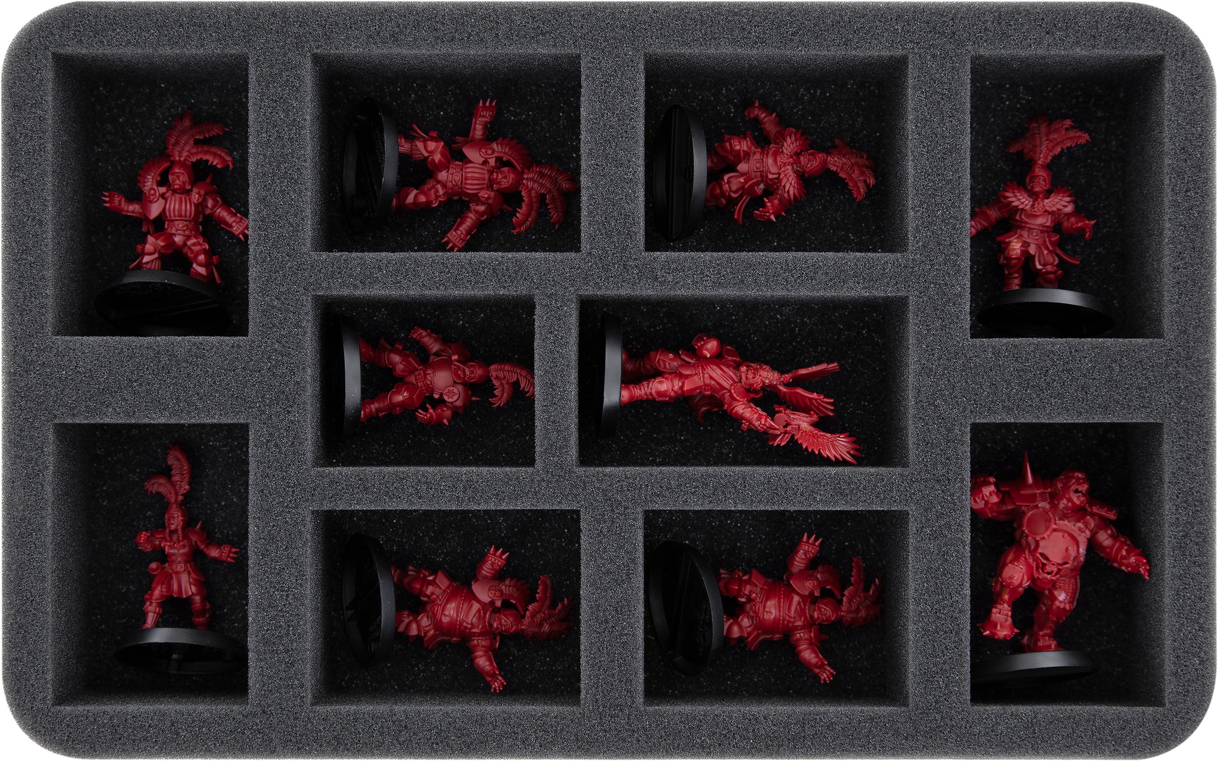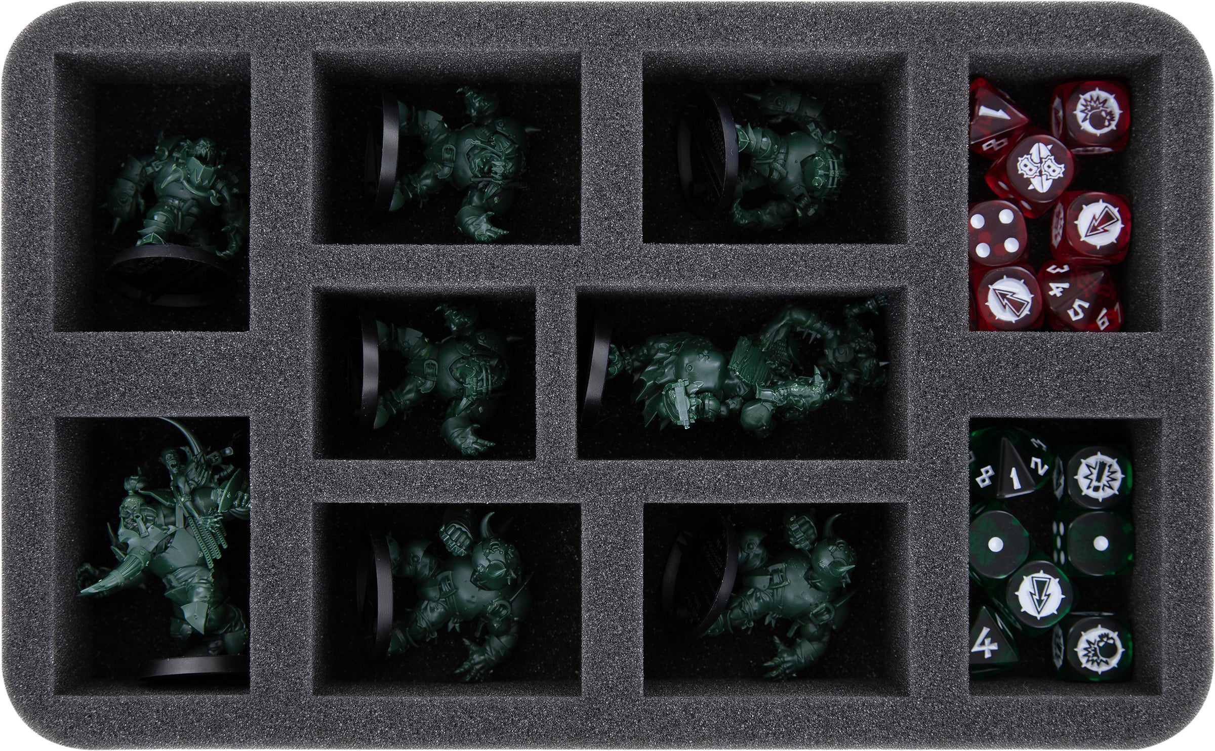 Three Feldherr Half-Size foam trays take care of the well-being of your players. On the two inserts with 10 compartments each (HSLM050BO) you store the larger models, such as the Black Orcs or the Linemen and Bodyguards of the Imperial Nobility Team.