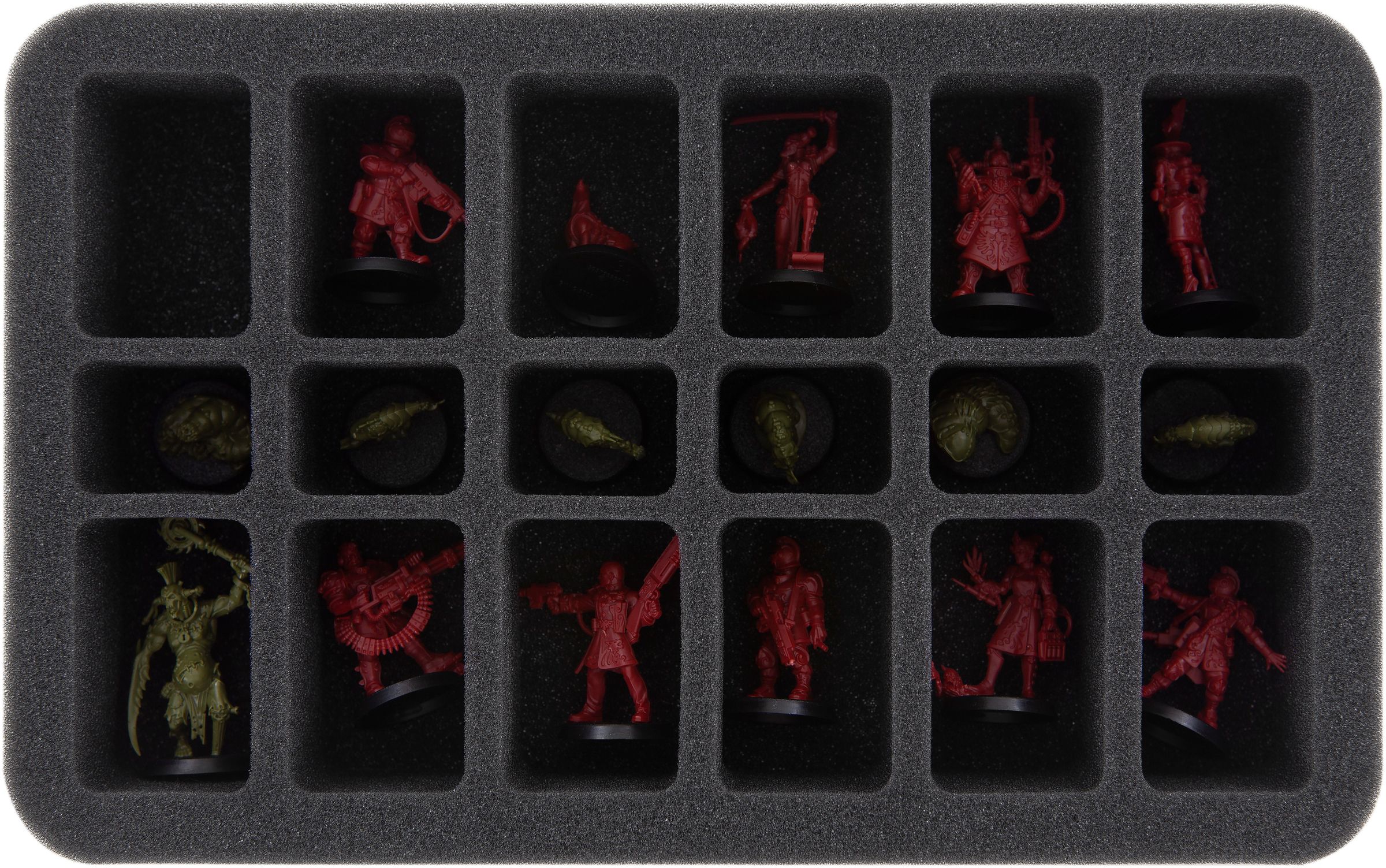A total of 44 compartments of different sizes, spread over 3 half-size foam trays, offer your teams a safe place away from the Kill Zone. The compartments are sized to fit most Kill Team models with 25 mm round base. They can also be used to sort the tokens and to store the dice.