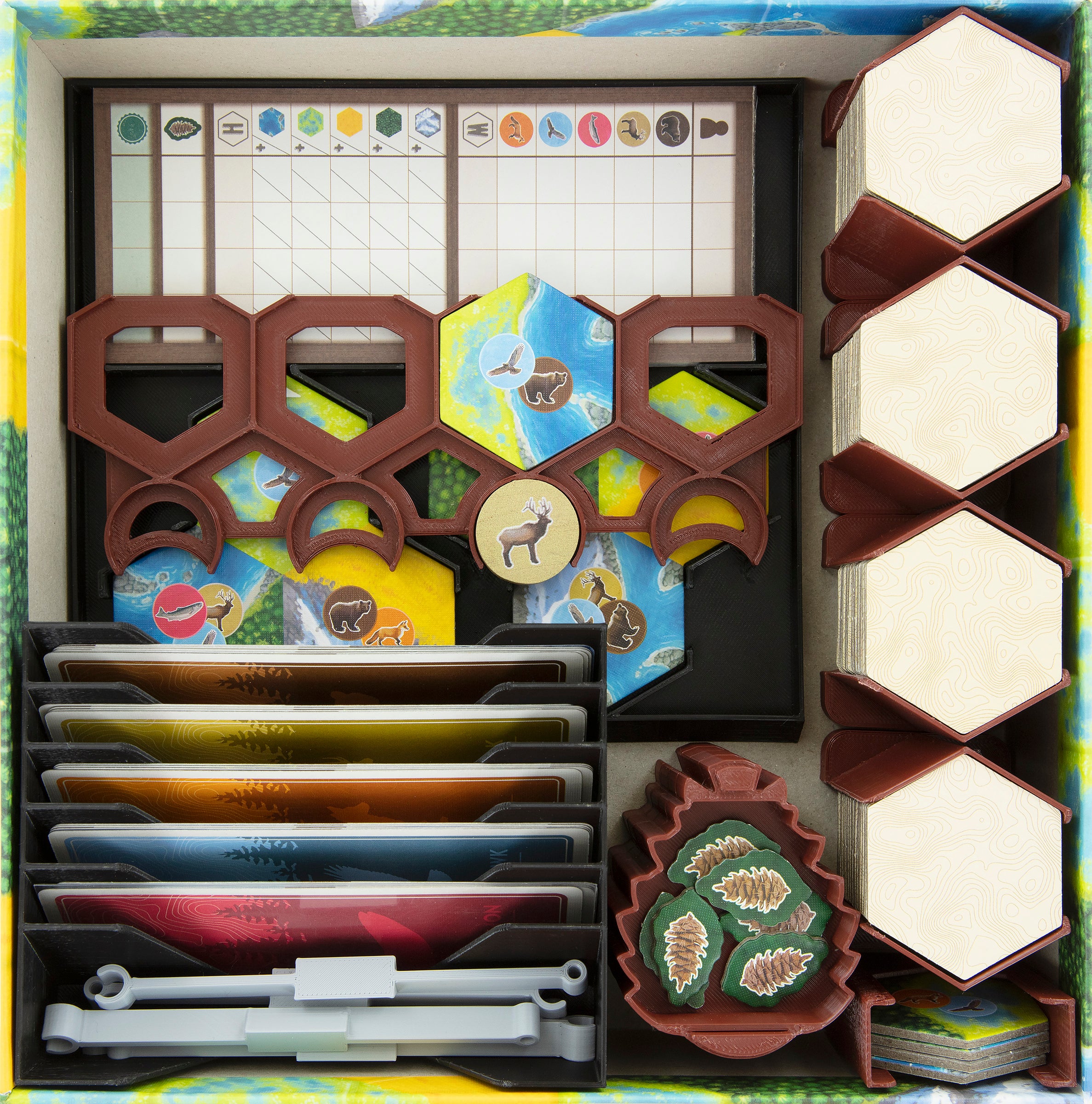 To ensure that your habitats soon overflow with life, we have the ideal Organizer for your board game box and the tabletop. The trays not only provide orderly conditions in your board game box, but they support you directly on the game table and help you keep track of your creation. This way, you can easily create the national park of your dreams, and Habitat Tiles and Wildlife Tokens will soon form a flawless unity.