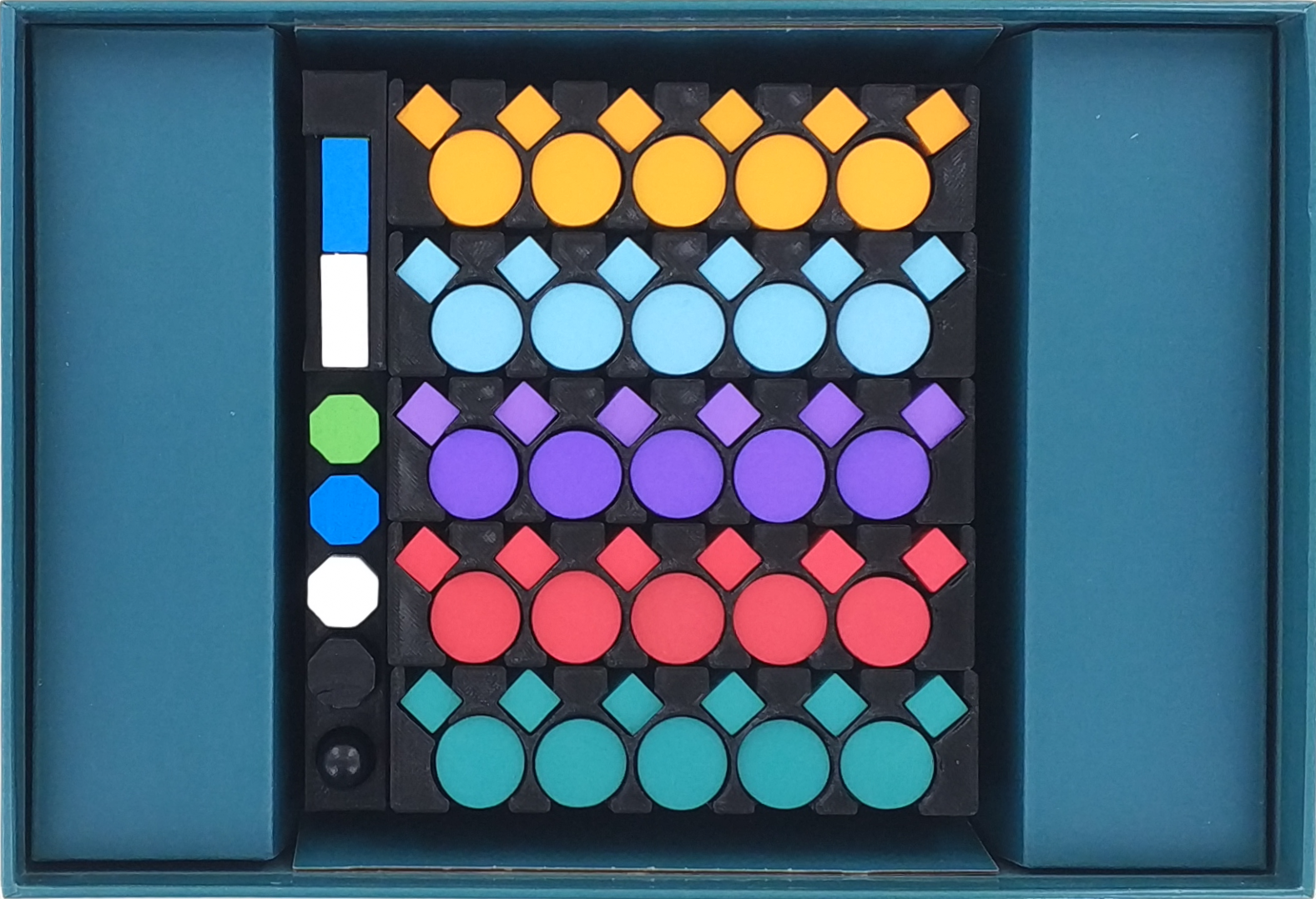 - 5 plastic player trays, each with eleven compartments for color-sorted game tokens like discs and cubes
