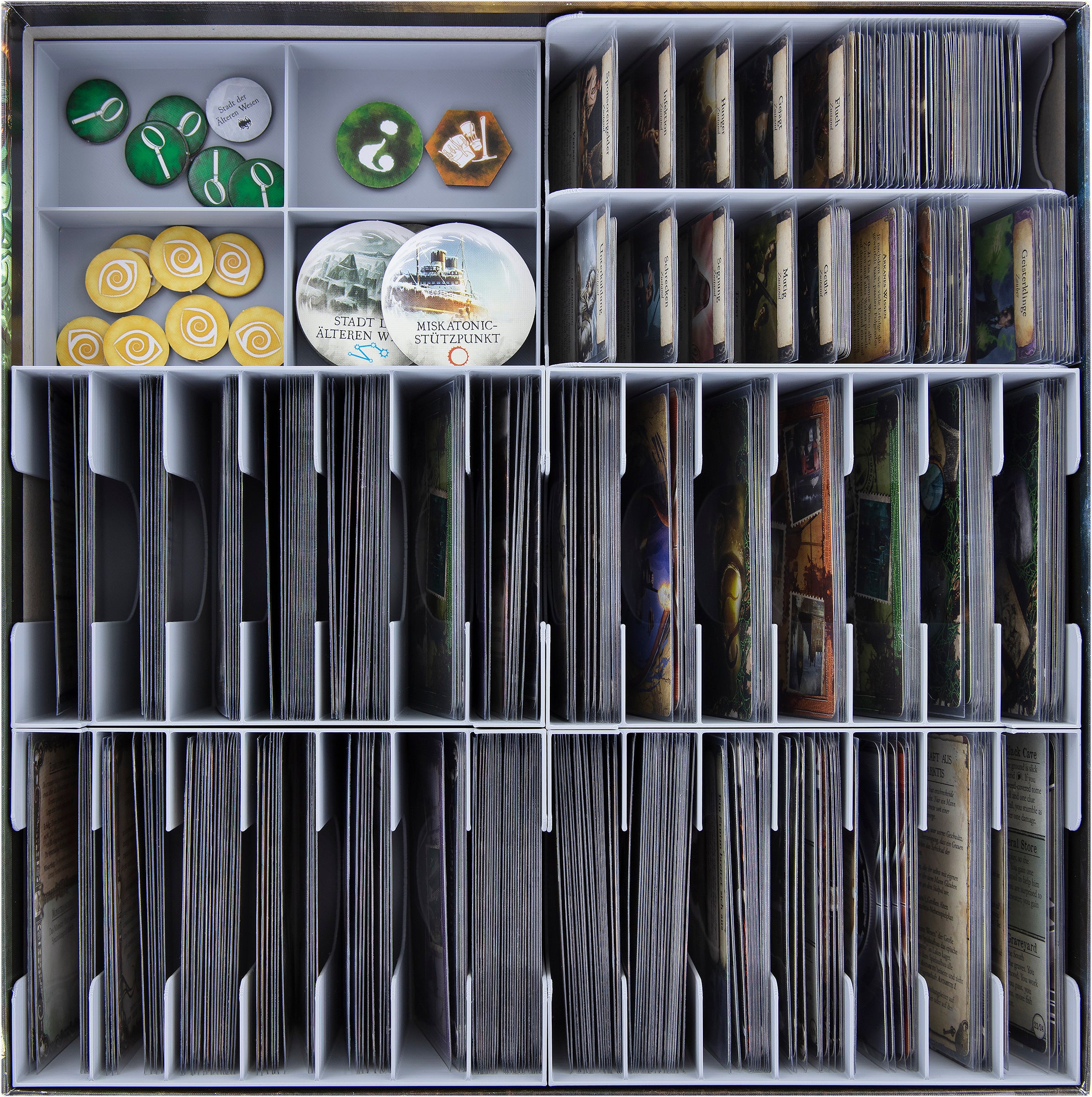 - The four card holders, each with 7 compartments, provide space for the cards in Standard format. (E.g. Mystery cards, Mythos cards) If you arrange two card holders next to each other, there will be a recess at the top. The Investigators and Ancient One Sheets will fit here in a visible place.