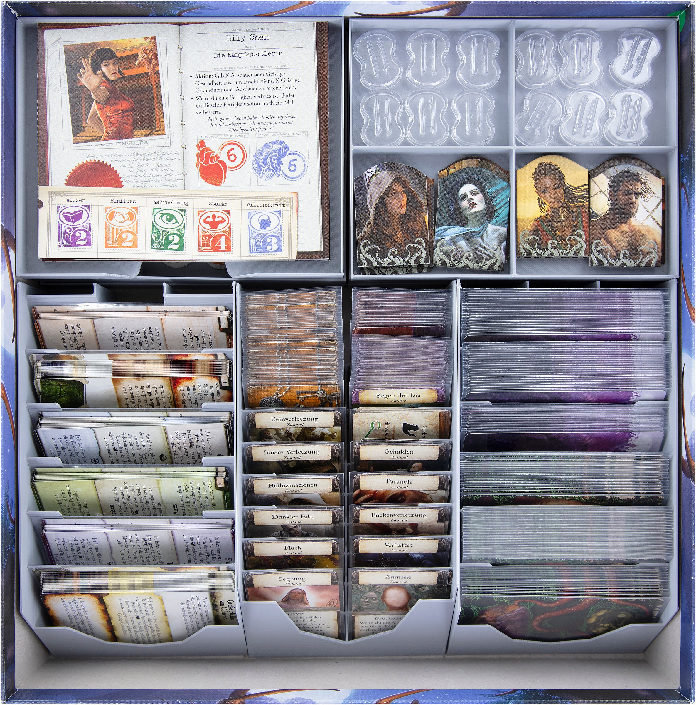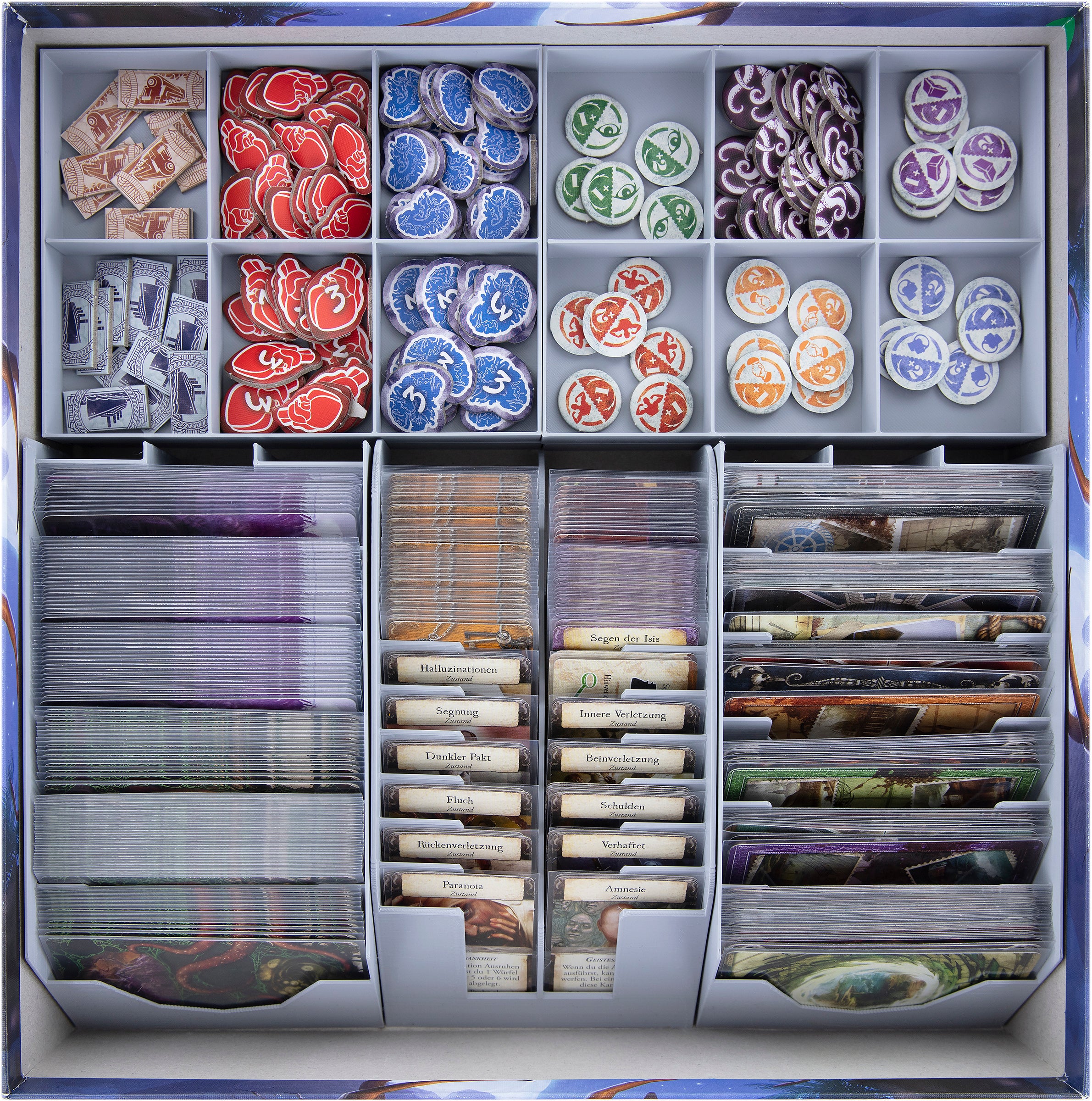 While the world slowly goes down the drain, we take care of your game material. This way you can fully concentrate on figuring out the mystery behind the world's chaos. The token and card holders help to keep your game material always neatly organized. This saves you time, as tedious pre-sorting is a thing of the past. Thanks to the generic compartments in the trays, you decide on the best way to sort the markers and cards for you. For a quick start of the game simply distribute the trays on the game table and you can start playing with your friends.