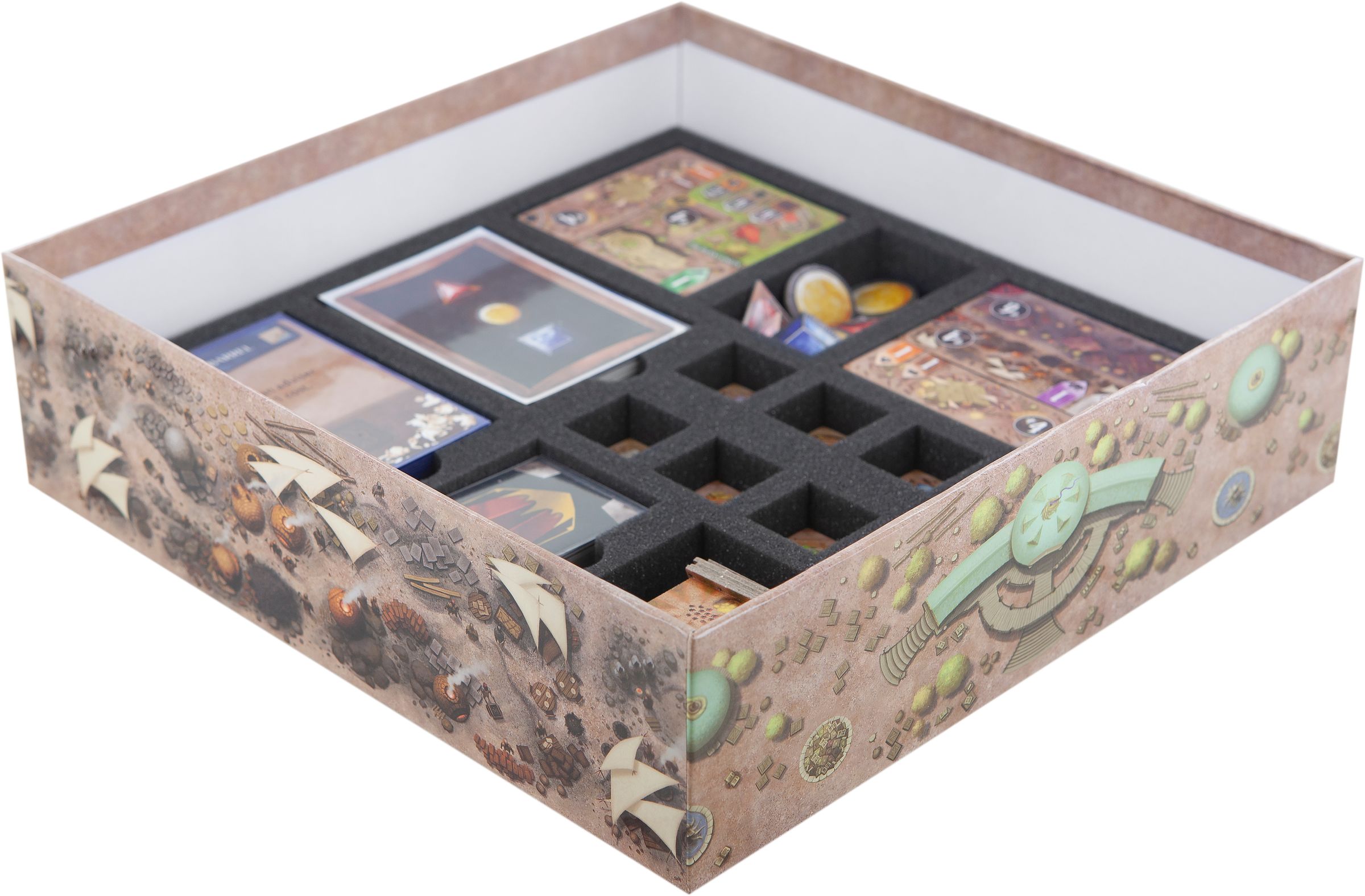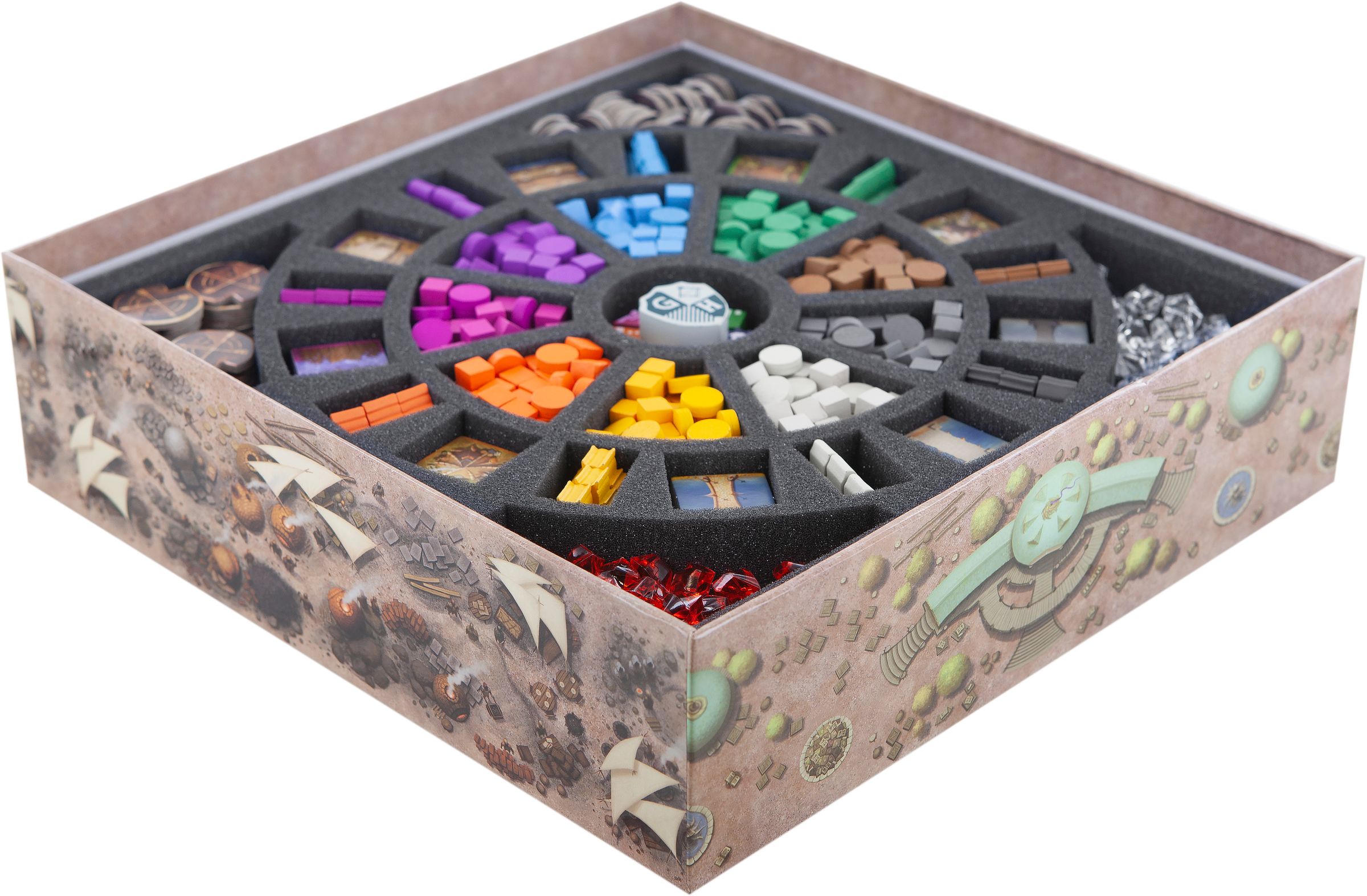 The trays fit exactly into the game box – nothing slips, nothing wobbles. In addition, the Organizer comes with a matching foam topper. The topper is placed on the upper foam tray and will thus keep the components from falling out. The larger game components – Game Board, Advisory Board, etc. – are to be placed underneath the trays or on top of the Organizer.