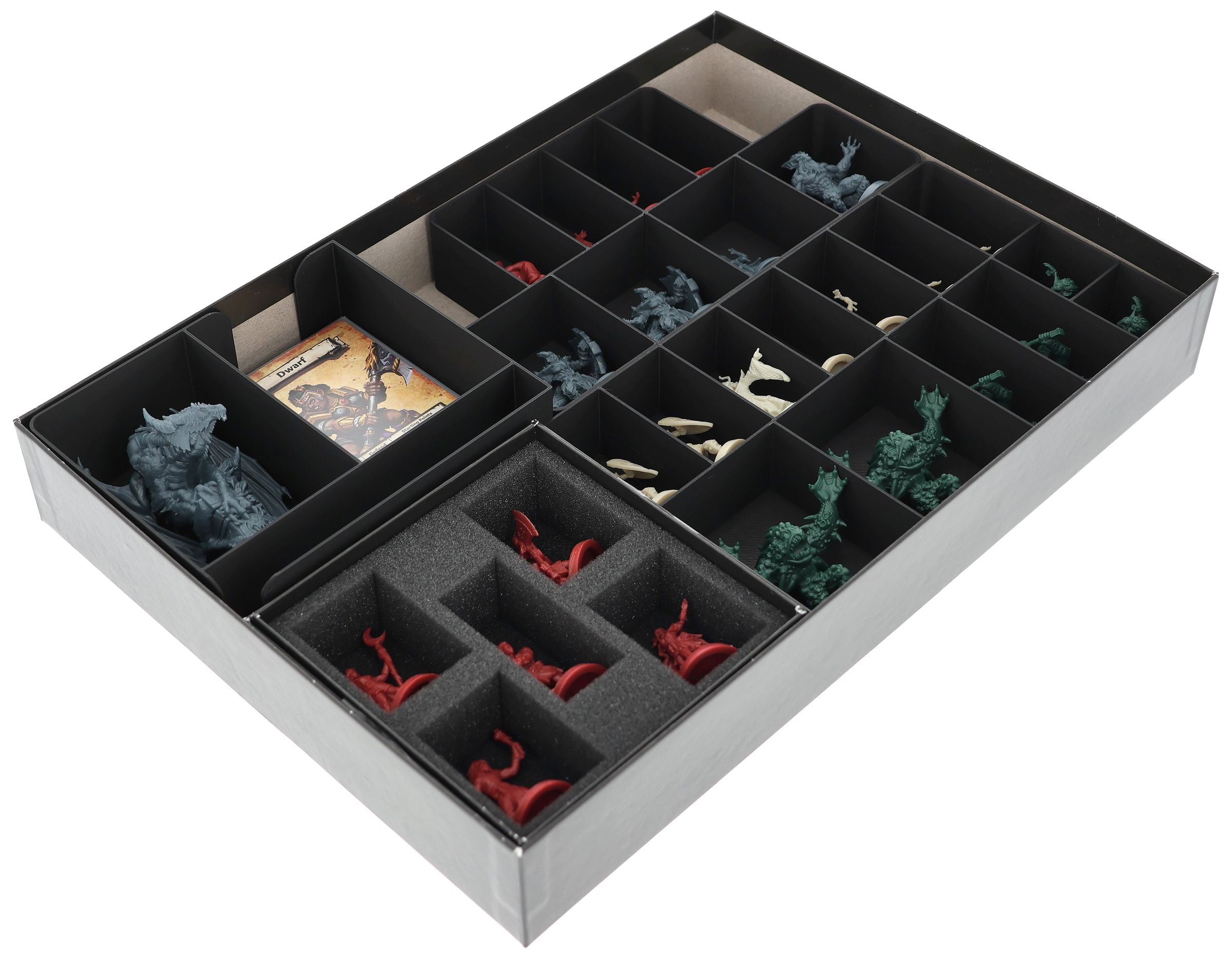 - Thanks to the clear and spacious compartments, you can find and remove your miniatures and game material more quickly and easily than with the original plastic insert.