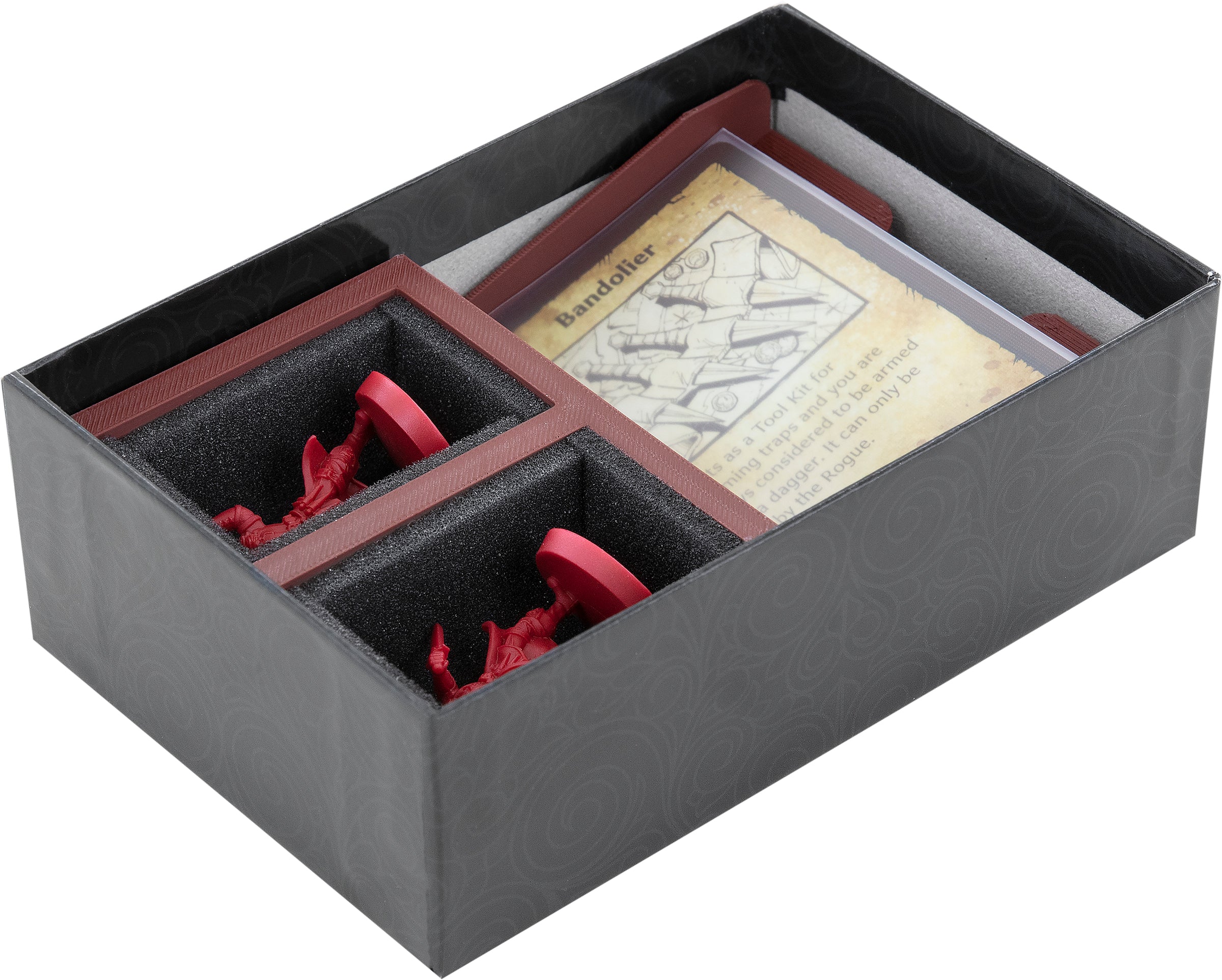 - Besides a card compartment, the tray provides two compartments for your miniatures. They are lined with foam mats.