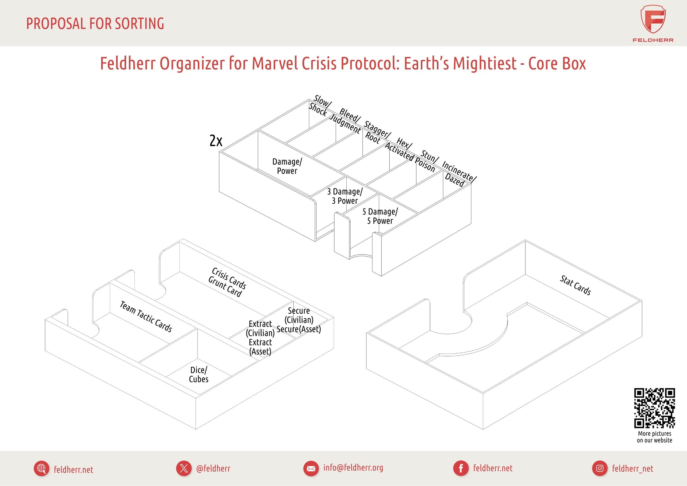 - The set fits exactly into the original game box of Marvel: Crisis Protocol - Earth’s Mightiest Core Set (dimensions of the set: 335 x 280 x 135 mm high).