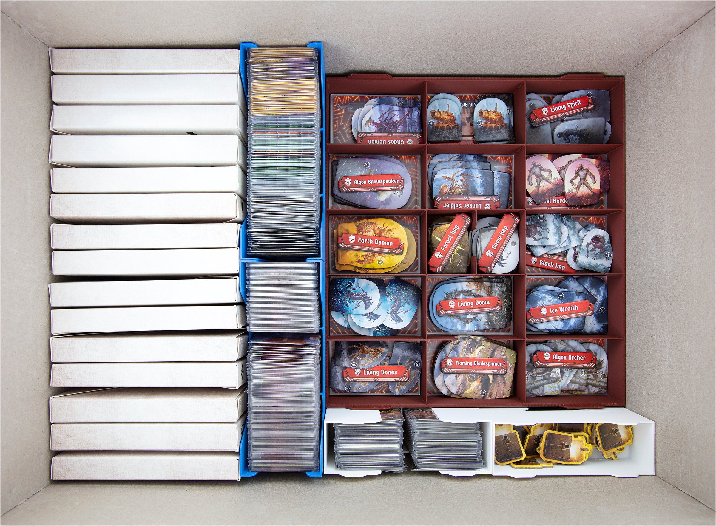 - The Organizer trays are not designed for the contents of the Large Tuck Boxes. Store contents in their original boxes and place them alongside the plastic inserts (see proposal sheet). Due to limited space, cards only fit unsleeved in Tuck Boxes.