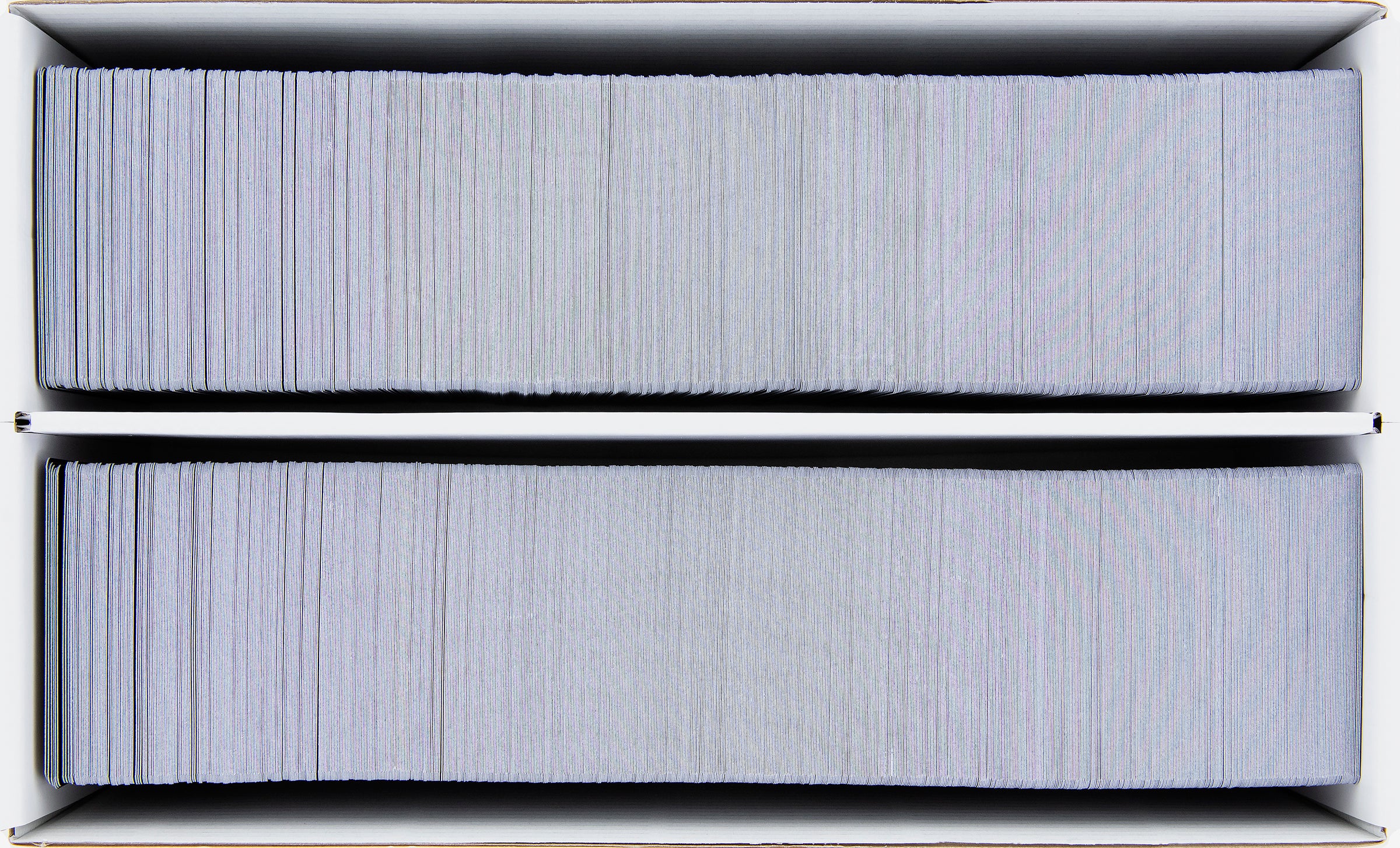 A partition in the middle of the box divides it into two equal-sized compartments. This allows the cards to be lined up neatly without mixing during transport.