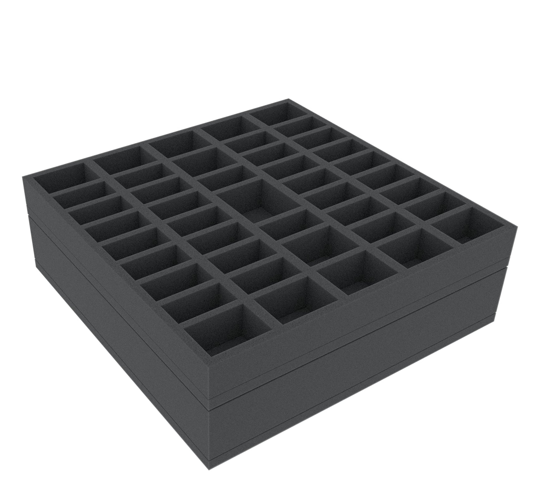 The two foam trays provide a secure hideout for your miniatures. Each miniature has its own custom-fit cut compartment. Since one miniature protrudes, the set includes an additional foam topper with a corresponding cutout. Place this on the lower insert.