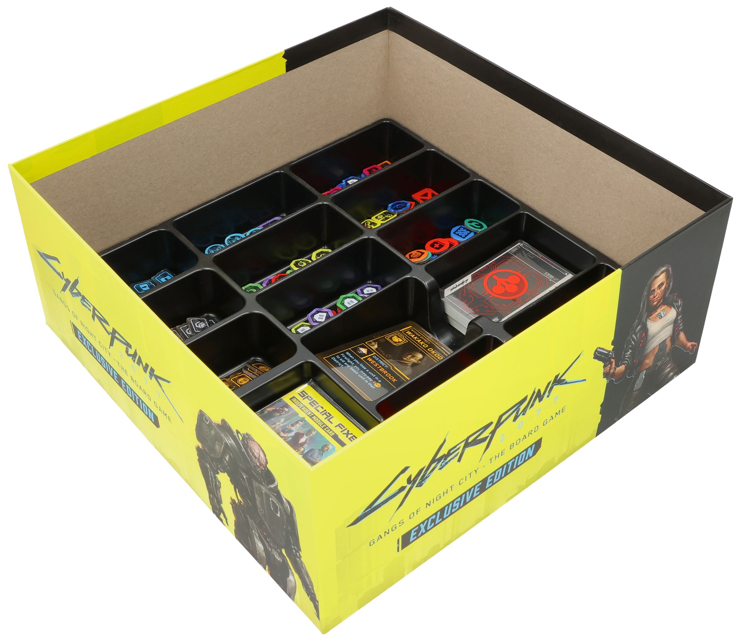 - The set fits exactly in the original board game box of Cyberpunk 2077: Gangs of Night City - The Board Game - Exclusive Edition.