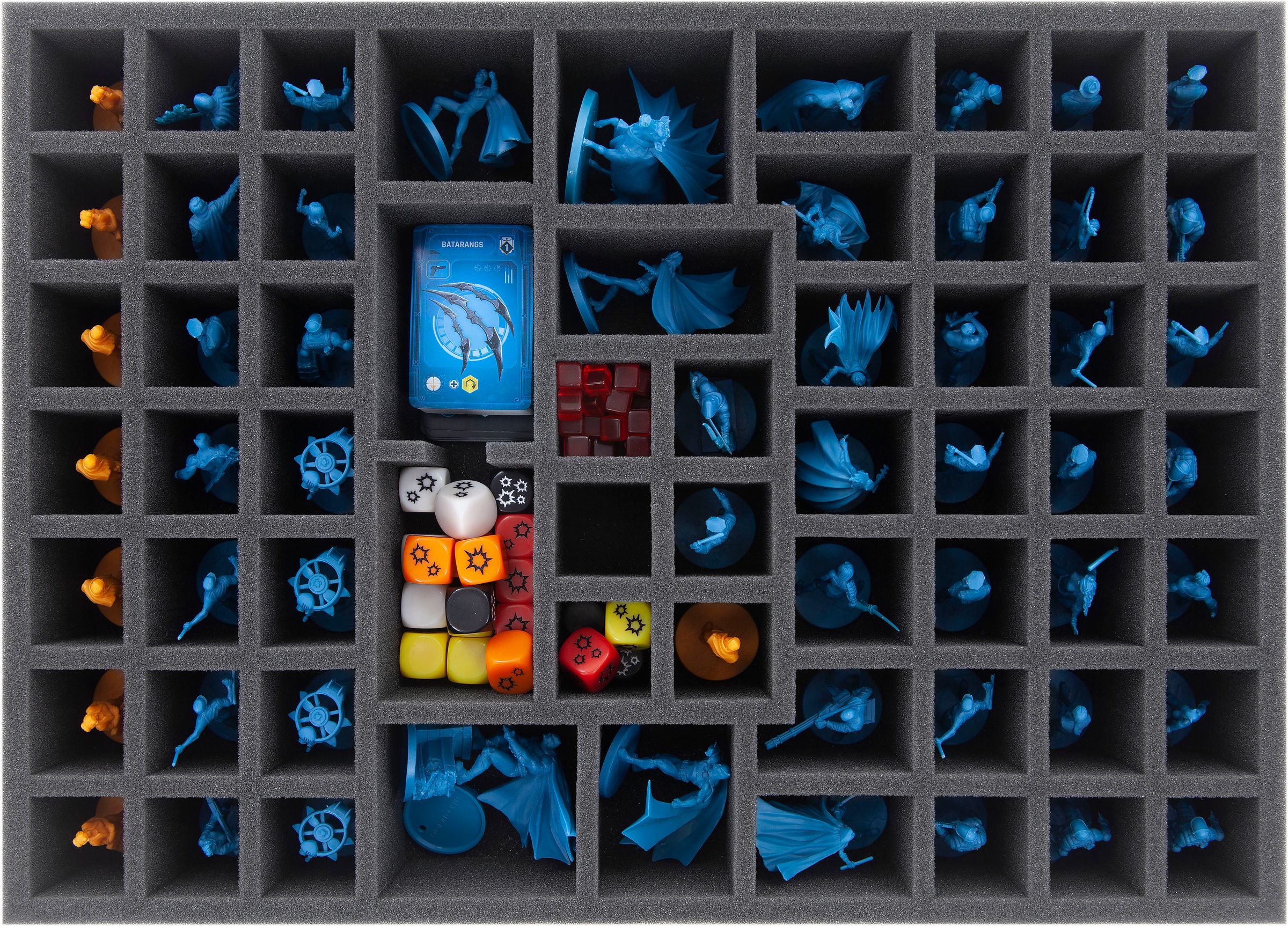 All miniatures from the Heroes Box find their place clearly arranged on the specially designed foam tray. 57 precisely fitting compartments ensure that the figures are optimally protected against damage. Black Canary's nunchucks are just as safe here as the Guards' batons, and the Drones on their flight bases.