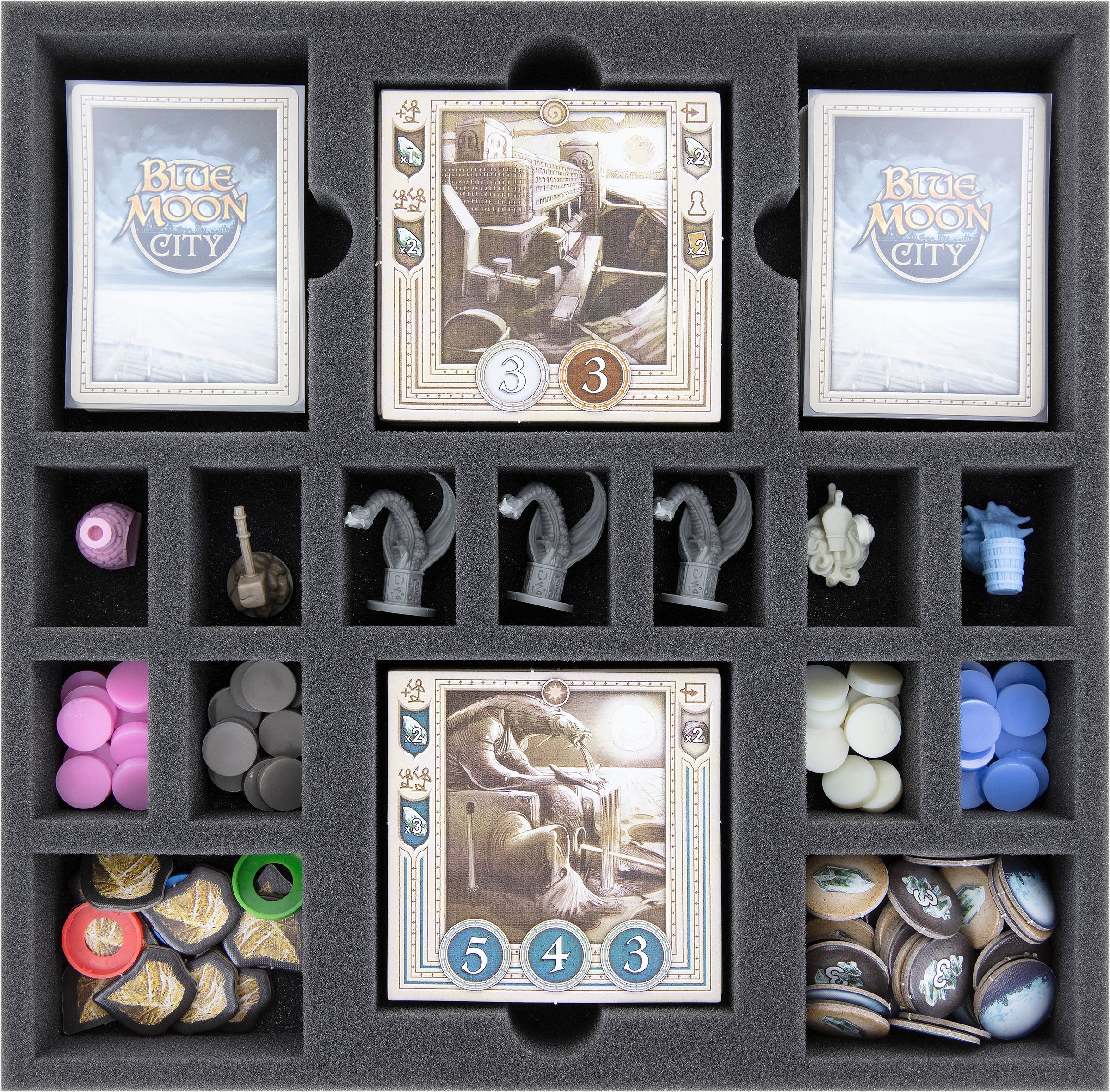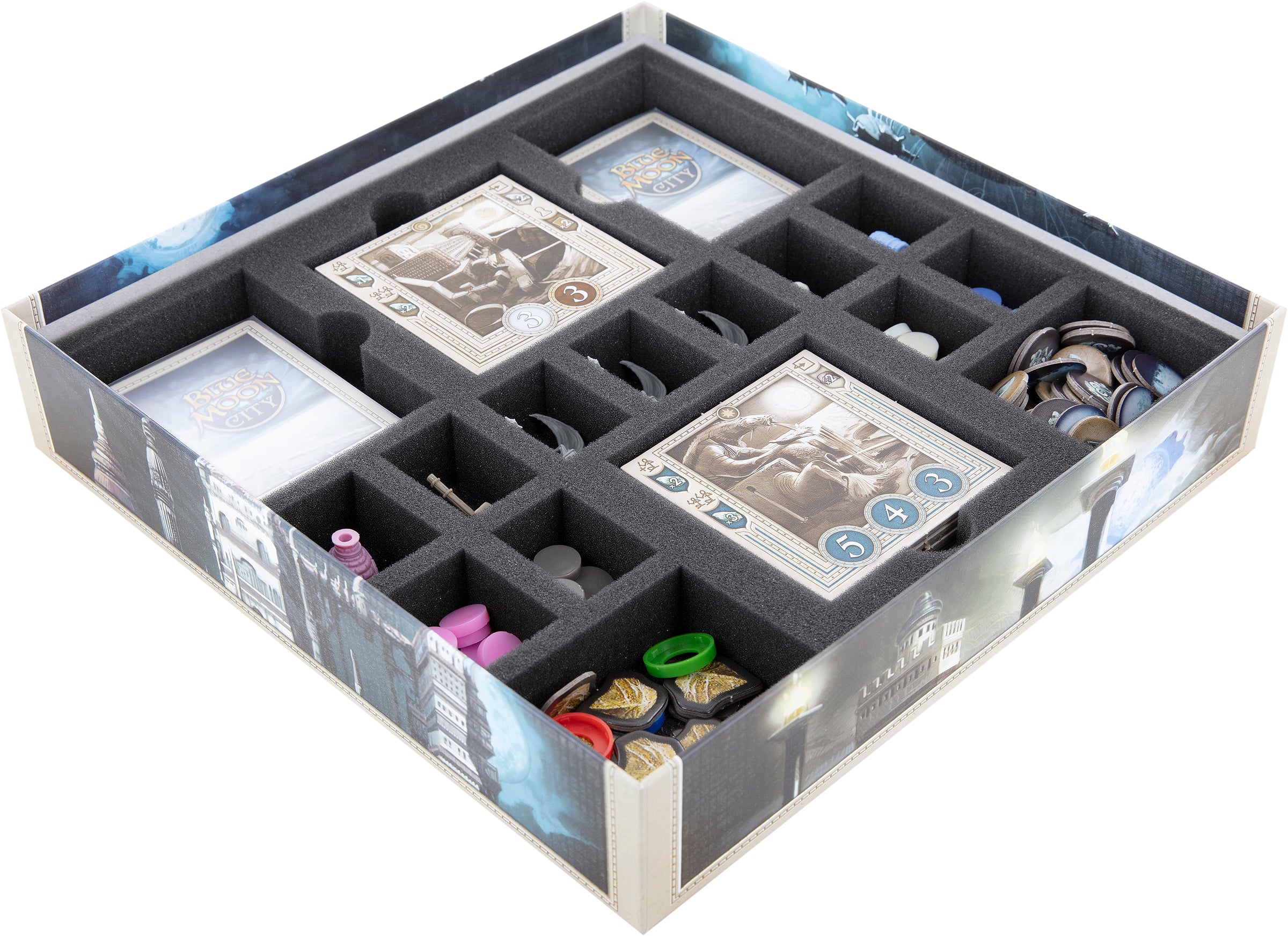 Blue Moon City lies in ruins after the Dark Ages. Rebuild the city. To prevent any token from hindering you from accomplishing your monumental task, we have the matching Feldherr foam set for you. With it, you sort all the game material neatly into the board game box and keep everything on track.