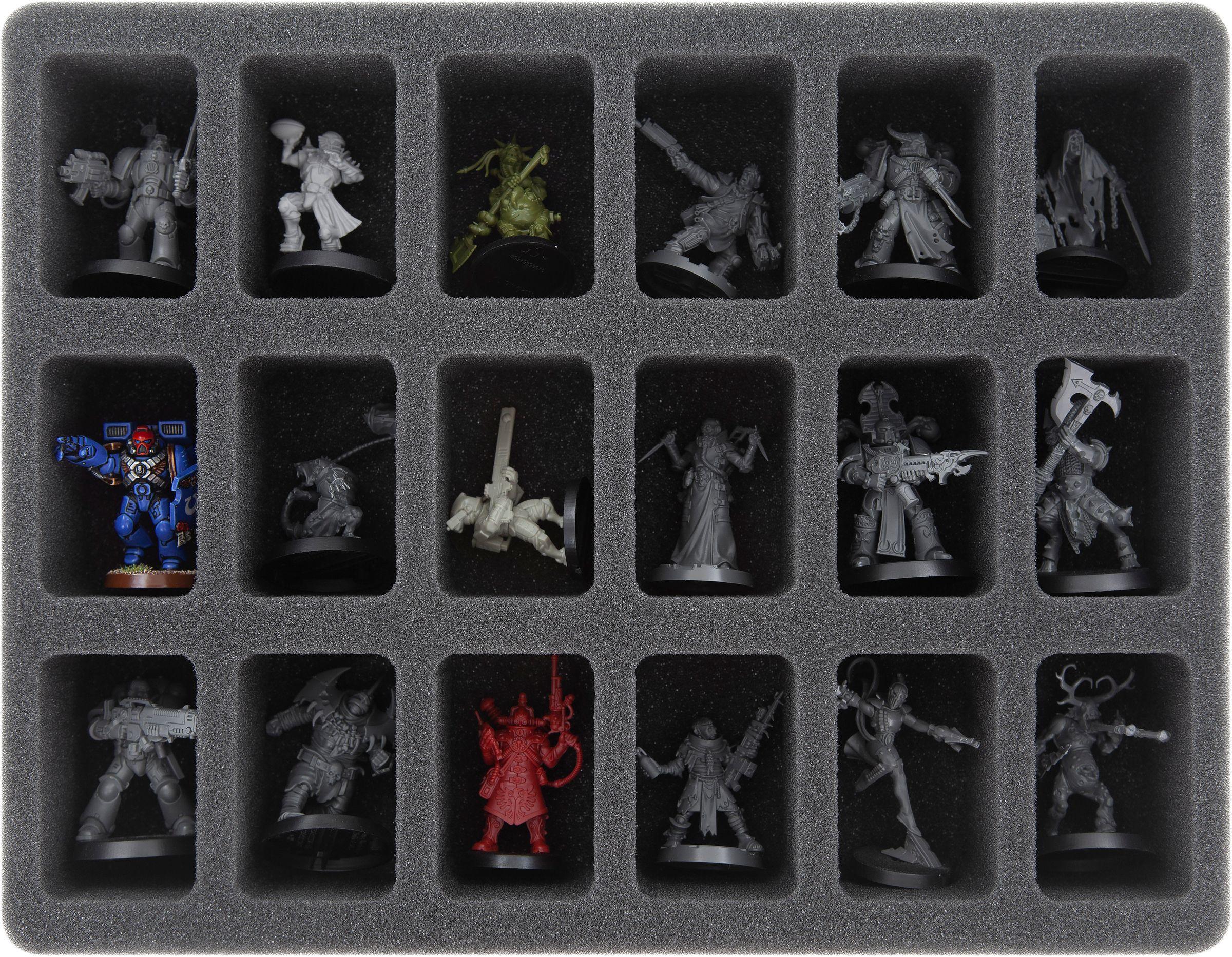 The foam set provides space for up to 72 miniatures on 32 mm bases. It doesn’t matter to which GamesWorkshop game system they belong. The set works reliably with infantry from your Warhammer 40,000 or Age of Sigmar armies and figures from more exotic titles like Blood Bowl, or your team from Kill Team.