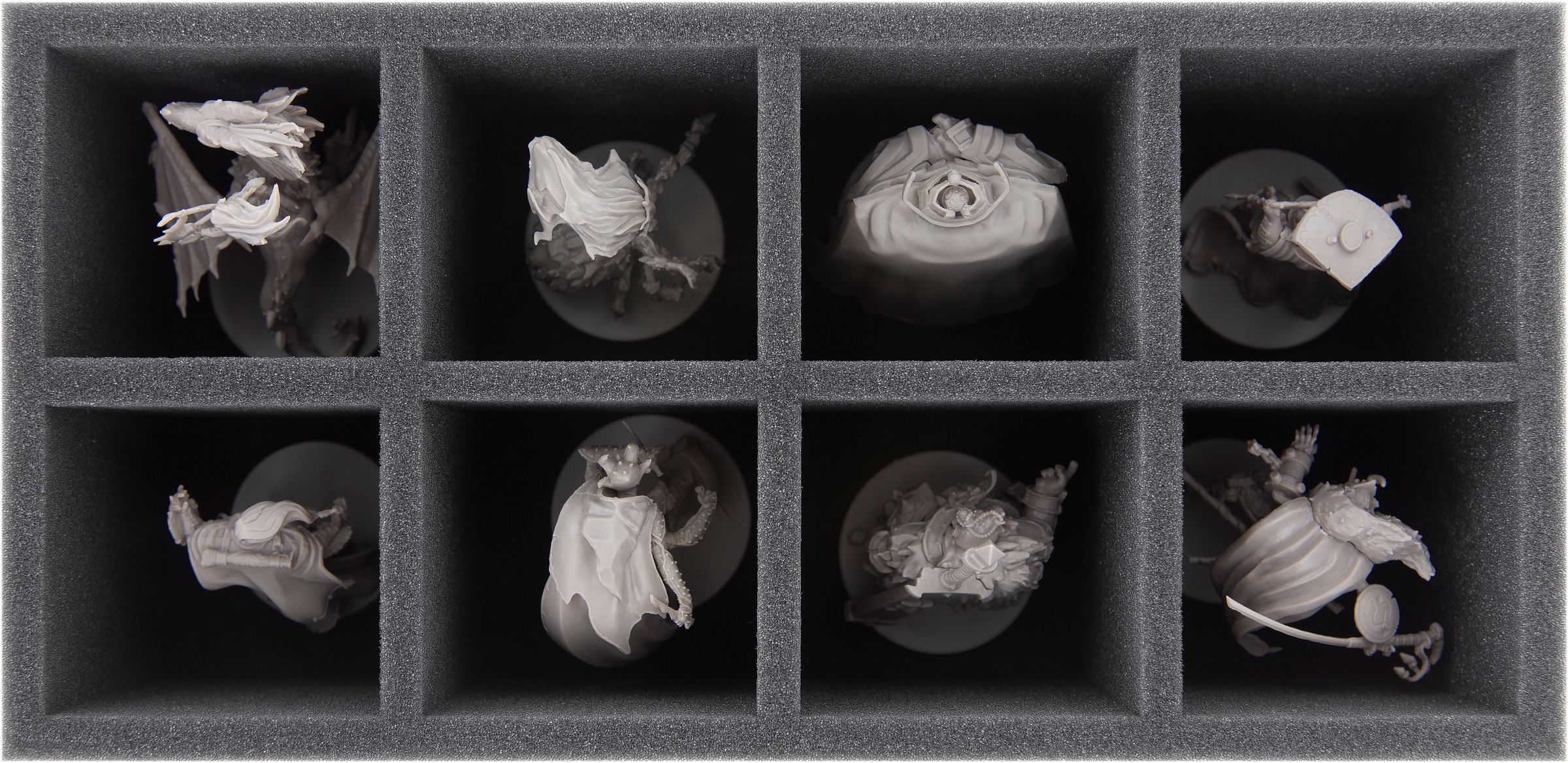Gently caressed by our fine-pored foam, your miniatures are as safe as it gets. Voltane gets to keep the marvelous wings, Shamia won’t break a leg. If you painted your models, you can also be sure that our foam protects reliably against scratches. The matching foam topper makes sure that no figure can fall out.
