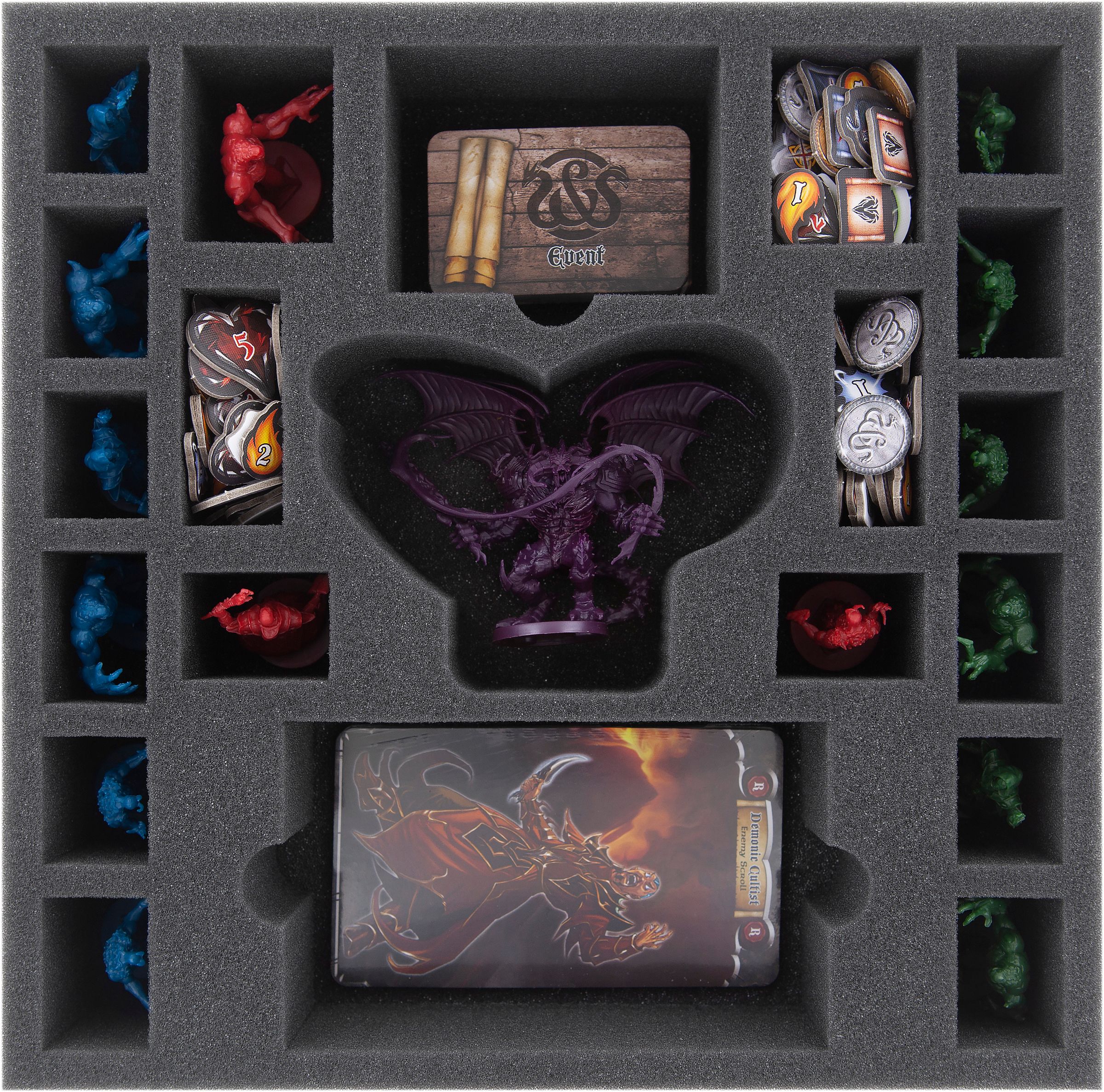 - 1 foam tray with 21 compartments for miniatures, tokens and cards (CBMEKI060BO)
