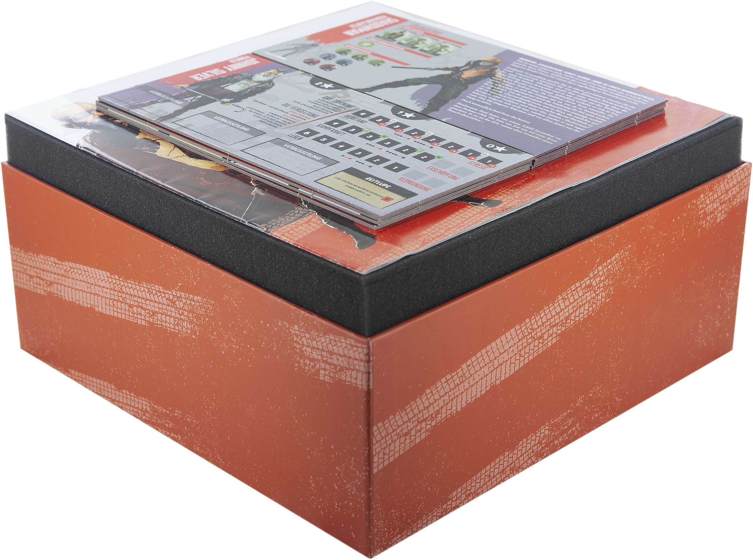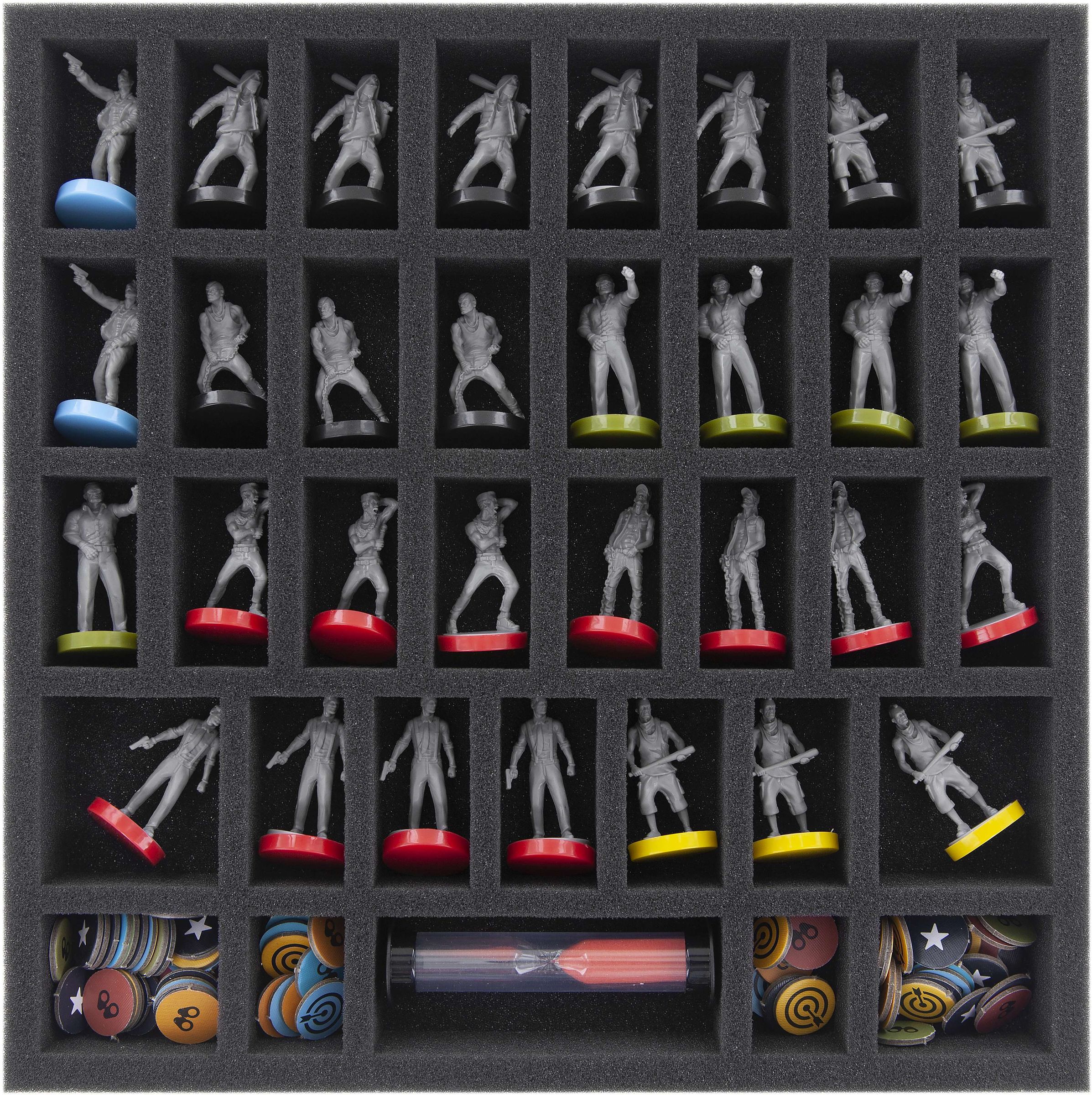 - 1 foam tray (285 mm x 285 mm x 35 mm) for miniatures, sleeved cards and dice
