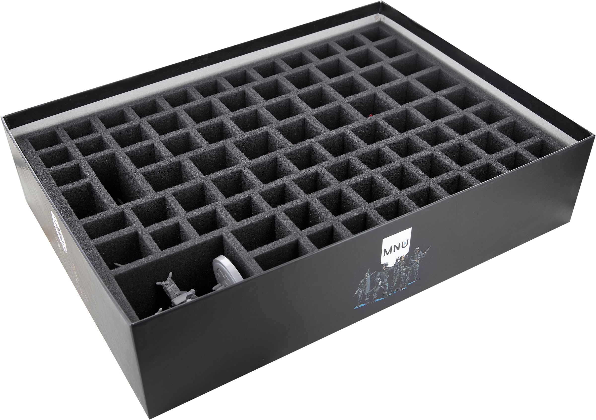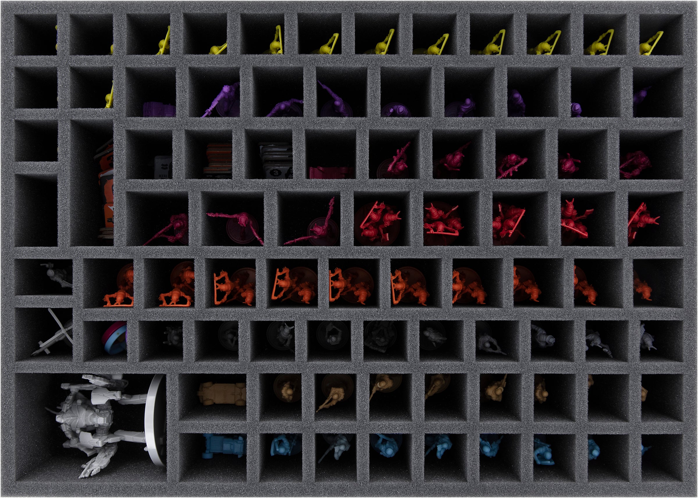 • 1 foam tray with 85 compartments for miniatures and small-sized game material like Mech Tiles, Faction Base Tiles, Outpost Tiles, Stat trackers and Faction Rings