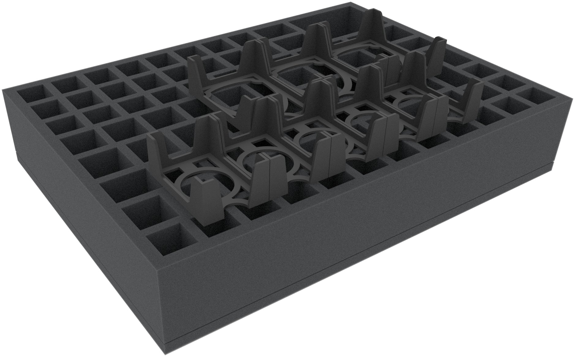 After you have accommodated miniatures and the small-sized game material in the foam tray, you secure the tray with the included foam topper. This will prevent figures from breaking off during transport or bumping into the lid of the Storage Box.